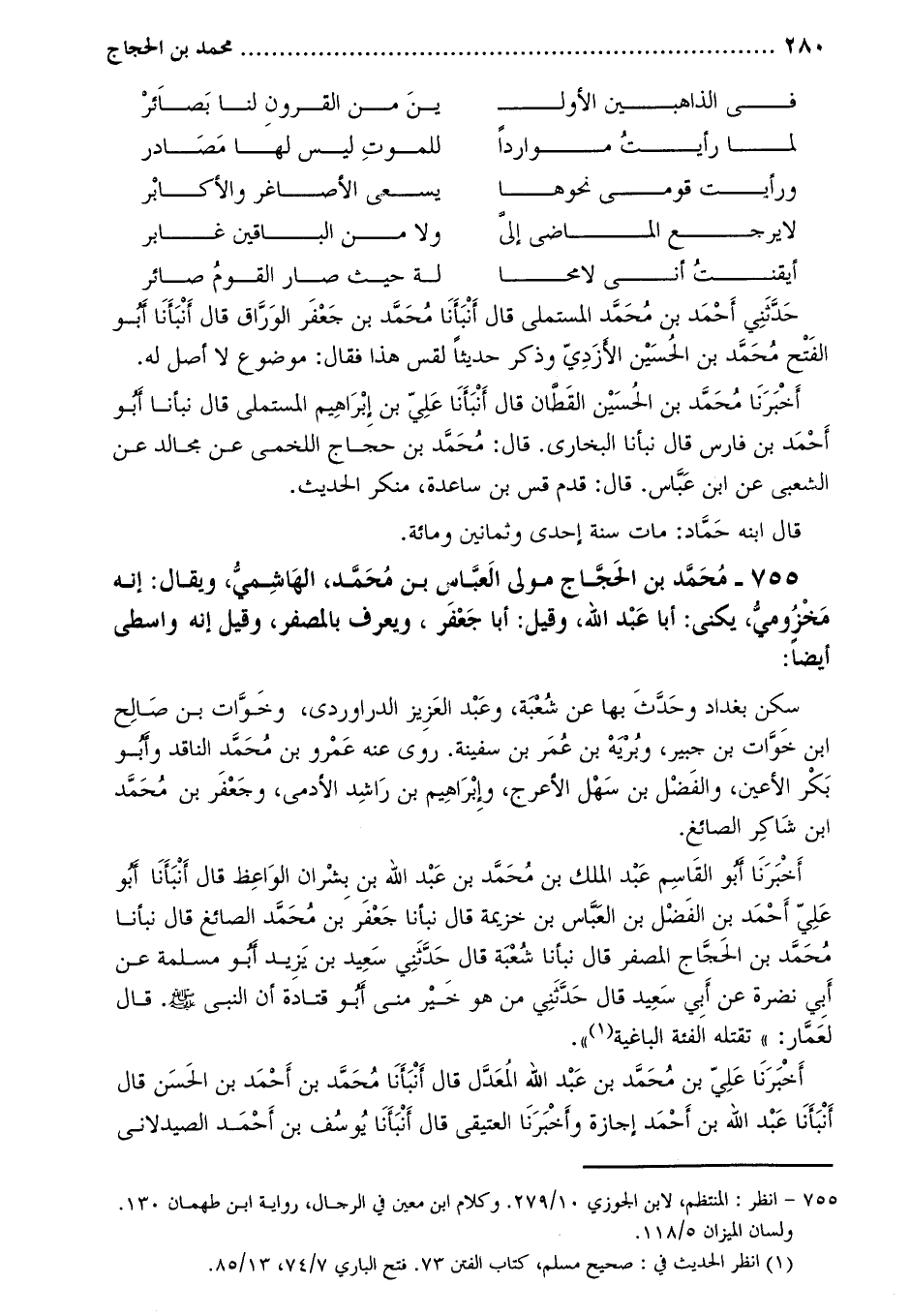 755- محمد بن الحجاج مولى العباس بن محمد، الهاشمي، ويقال: إنه مخزومي، يكنى: أبا عبد الله، وقيل: أبا جعفر، ويعرف بالمصفر، وقيل إنه واسطي أيضا [1] :