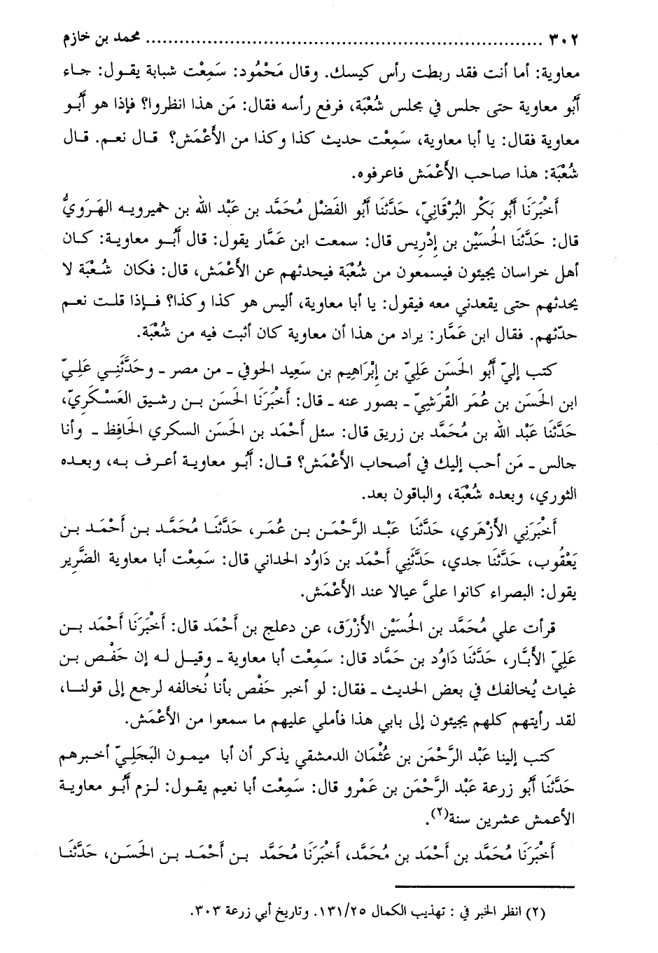 كَتَبَ إِلَيْنَا عَبْدُ الرَّحْمَنِ بْنُ عُثْمَانَ الدِّمَشْقِيُّ يذكر أن أبا ميمون البجليّ أخبرهم حَدَّثَنَا أَبُو زرعة عَبْد الرَّحْمَن بْن عمرو قَالَ: سمعت أبا نعيم يقول: لزم أبو معاوية الأعمش عشرين سنة [1] .