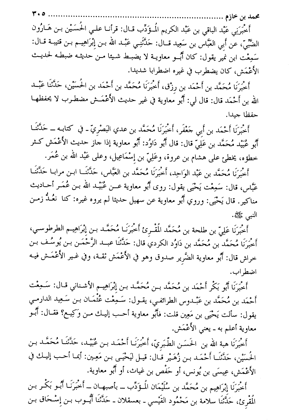 أَخْبَرَنَا عَلِيّ بْن طلحة بْن مُحَمَّد الْمُقْرِئ أخبرنا محمّد بن إبراهيم الطرطوسي، أخبرنا محمّد بن محمّد بن داود الكردي قَالَ: حَدَّثَنَا عبد الرحمن بن يوسف بن خراش قَالَ: أبو معاوية الضرير صدوق وهو في الأعمش ثقة، وفي غير الأعمش فيه اضطراب.