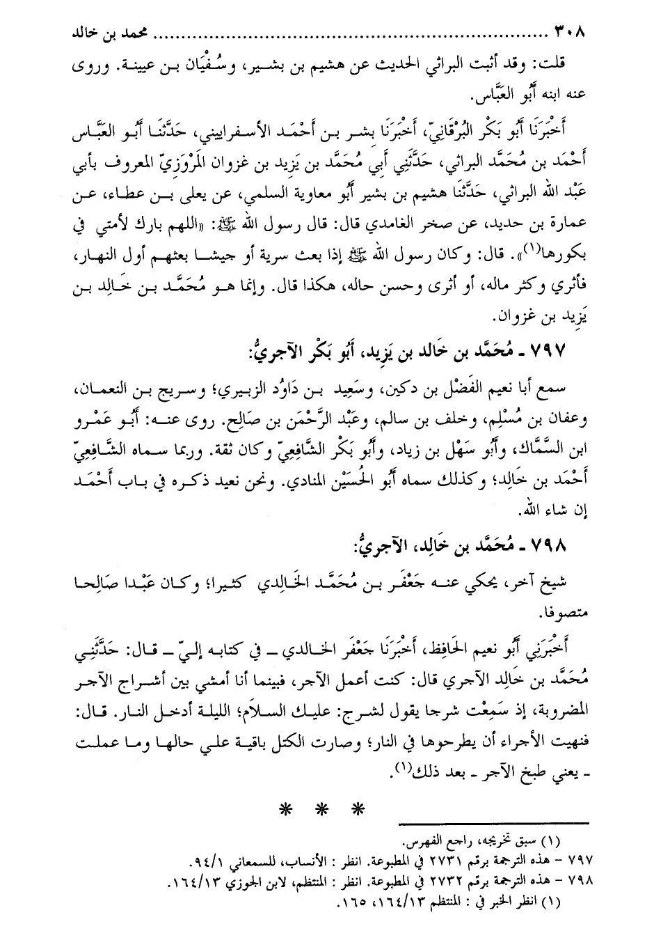 [3] 798- هذه الترجمة برقم 2732 في المطبوعة. انظر: المنتظم، لابن الجوزي 13/164.
