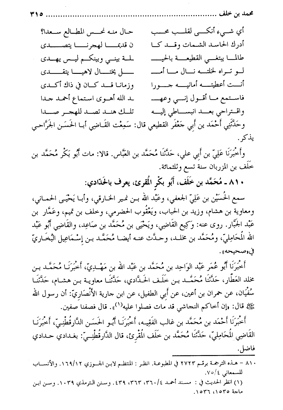 [1] 810- هذه الترجمة برقم 2723 في المطبوعة. انظر: المنتظم لابن الجوزي 12/169. والأنساب للسمعاني 4/75.