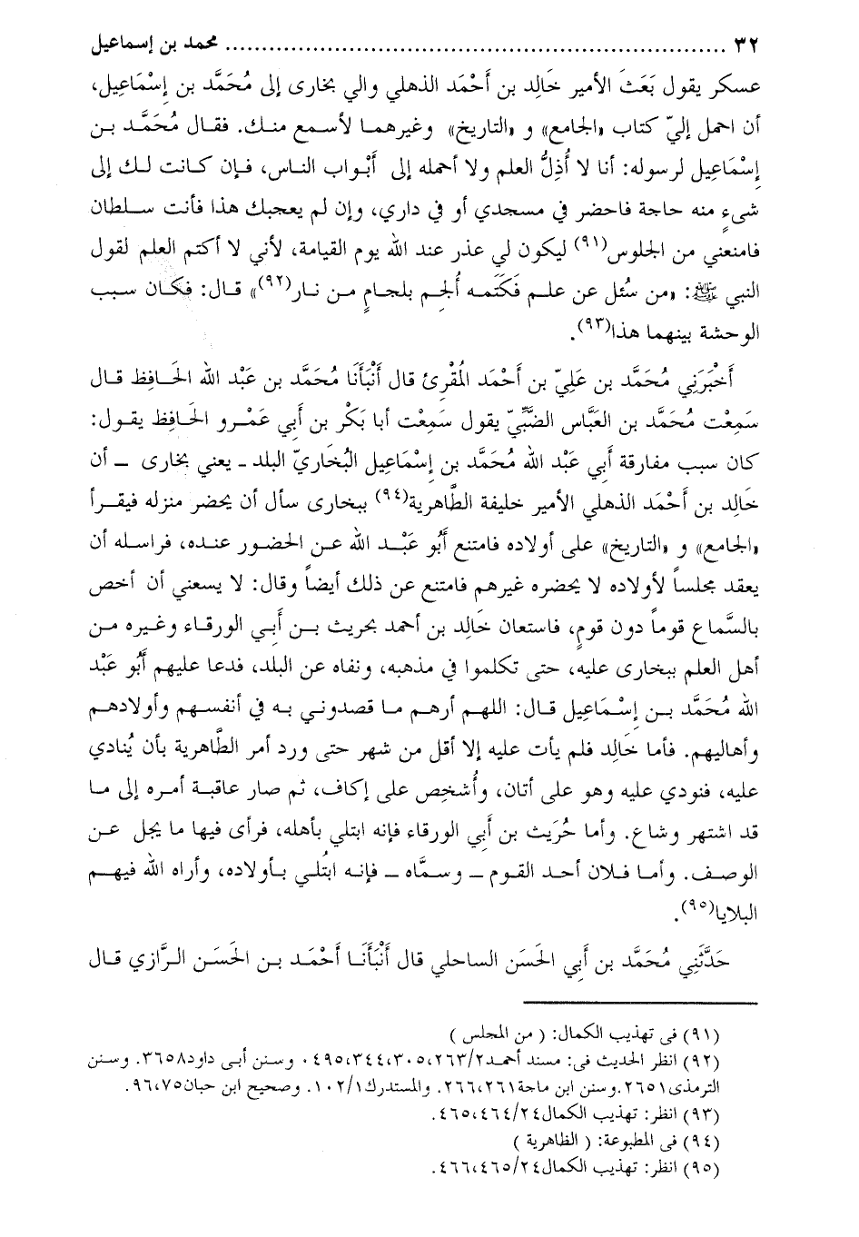 عَسْكَرٍ يَقُولُ بَعَثَ الأَمِيرُ خَالِدَ بْنَ أَحْمَدَ الذُّهْلِيُّ وَالِي بُخَارَى إِلَى مُحَمَّدِ بْنِ إِسْمَاعِيلَ، أَنِ احْمِلْ إليّ كتاب «الجامع» و «التاريخ» وَغَيْرِهِمَا لأَسْمَعَ مِنْكَ. فَقَالَ مُحَمَّدُ بْنُ إِسْمَاعِيلَ لِرَسُولِهِ: أَنَا لا أُذِلُّ الْعِلْمَ وَلا أَحْمِلُهُ إِلَى أَبْوَابِ النَّاسِ، فَإِنْ كَانَتْ لَكَ إِلَى شيء منه حاجة فاحضر فِي مَسْجِدِي أَوْ فِي دَارِي، وَإِنْ لَمْ يُعْجِبْكَ هَذَا فَأَنْتَ سُلْطَانٌ فَامْنَعْنِي مِنَ الجلوس [1] لِيَكُونَ لِي عُذْرٌ عِنْدَ اللَّهِ يَوْمَ الْقِيَامَةِ، لأَنِّي لا أَكْتُمُ الْعِلْمَ لِقَوْلِ