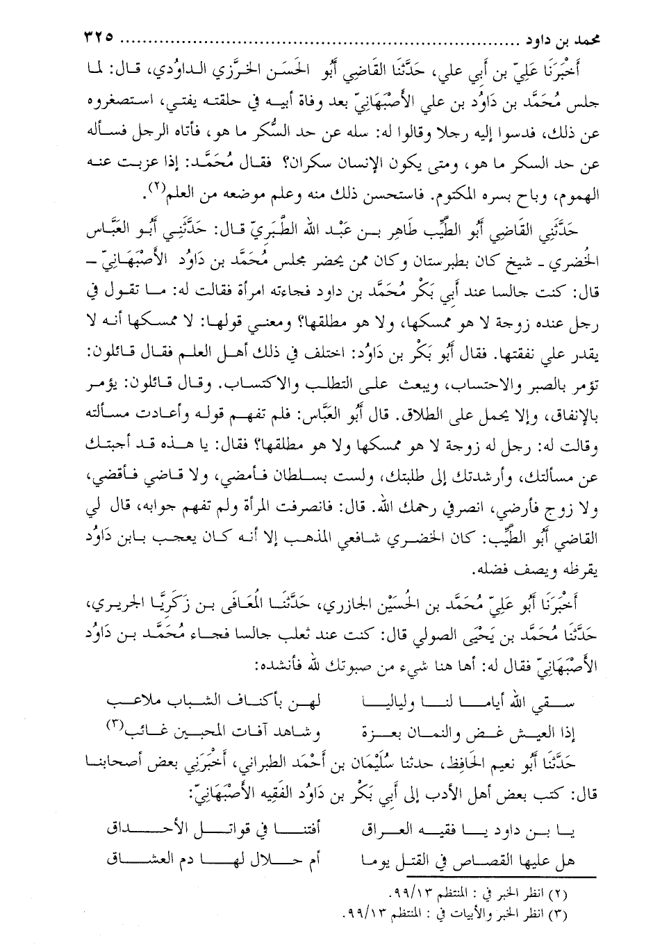 أَخْبَرَنَا أَبُو عَلِيٍّ مُحَمَّد بْن الْحُسَيْن الجازري، حدّثنا المعافى بن زكريّا الجريري، حَدَّثَنَا محمد بن يحيى الصولي قَالَ: كنت عند ثعلب جالسا فجاء محمّد بن داود الأصبهانيّ فقال له: أهاهنا شيء من صبوتك لله فأنشده: