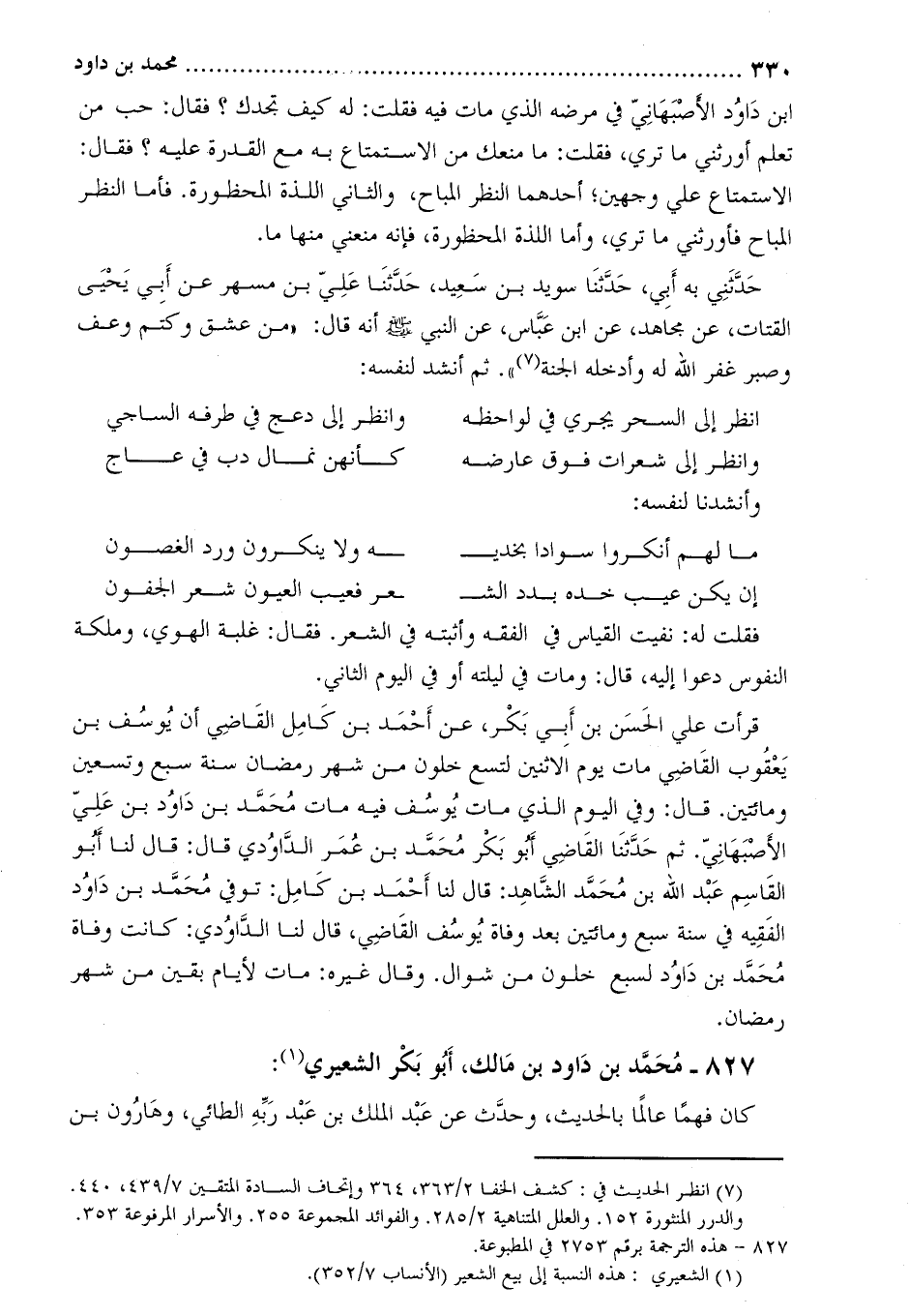 ابن دَاوُدَ الأَصْبَهَانِيِّ فِي مَرَضِهِ الَّذِي مَاتَ فِيهِ فَقُلْتُ: لَهُ كَيْفَ تَجِدُكَ؟ فَقَالَ: حُبُّ مَنْ تَعَلَّمَ أَوْرَثَنِي مَا تَرَى، فَقُلْتُ: مَا مَنَعَكَ مِنَ الاسْتِمْتَاعِ بِهِ مَعَ الْقُدْرَةِ عَلَيْهِ؟ فَقَالَ: