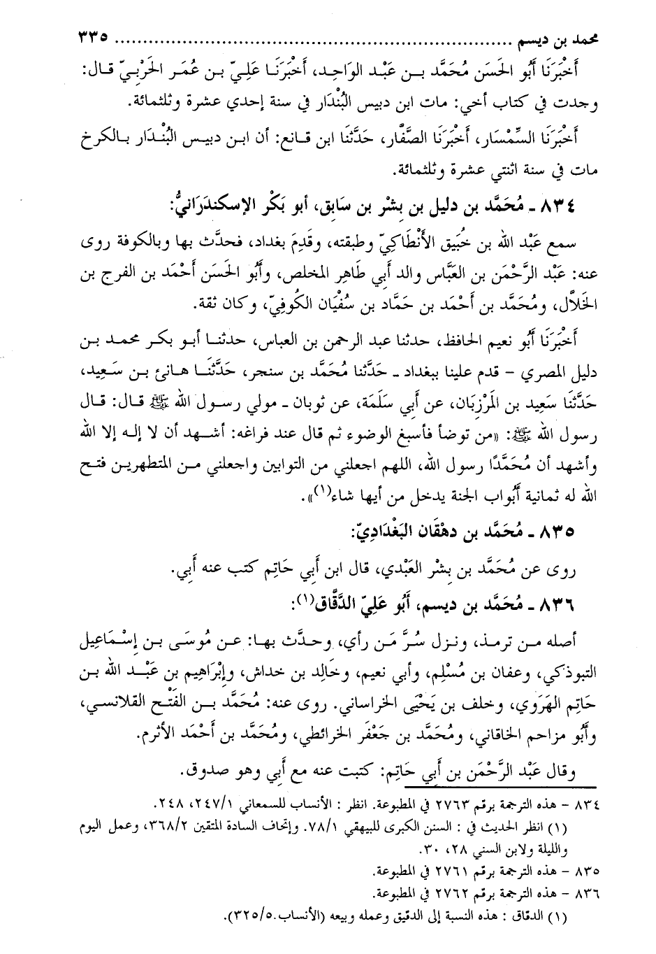 [1] 834- هذه الترجمة برقم 2763 في المطبوعة. انظر: الأنساب للسمعاني 1/247، 248.