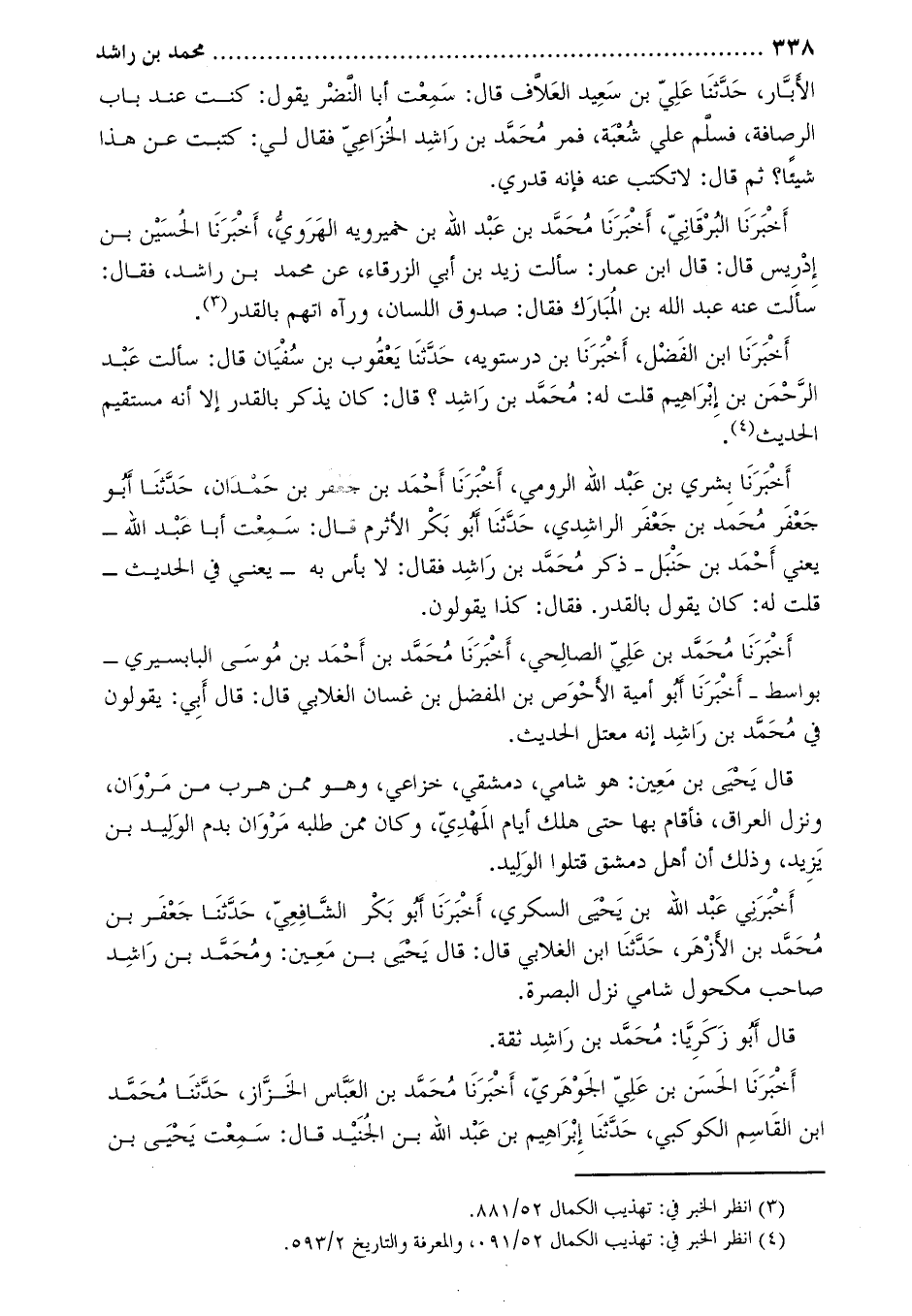 أخبرنا ابن الفضل، أخبرنا بن درستويه، حَدَّثَنَا يَعْقُوب بن سفيان قَالَ: سألت عَبْد الرحمن بن إبراهيم قلت له: محمد بن راشد؟ قَالَ: كان يذكر بالقدر إلا أنه مستقيم الحديث [2] .