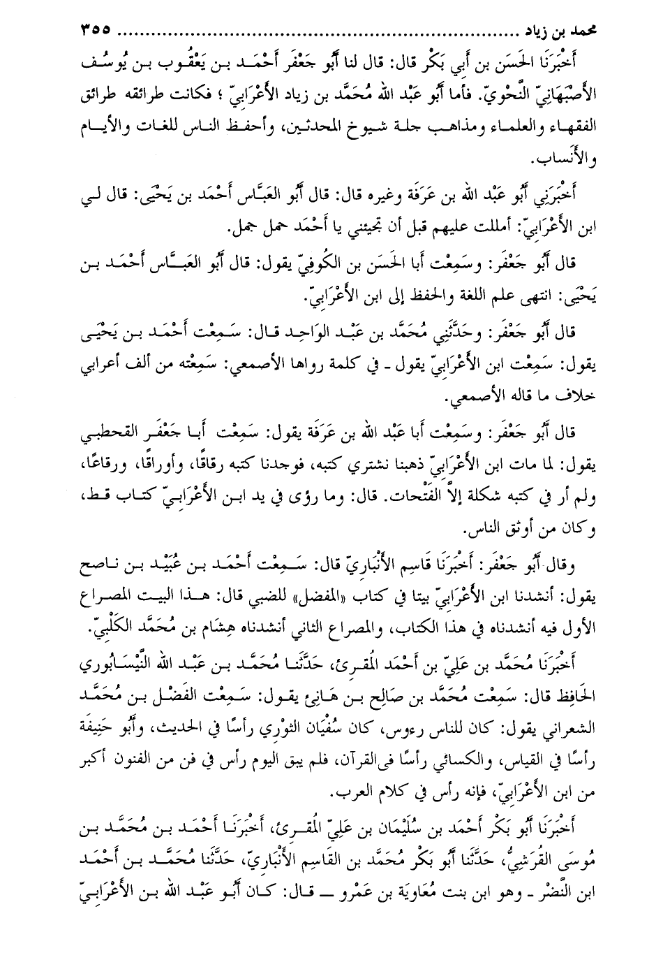 أَخْبَرَنَا أَبُو بَكْر أَحْمَد بْن سُلَيْمَانَ بْن عَلِيٍّ المقرئ، أَخْبَرَنَا أَحْمَدُ بْنُ مُحَمَّدِ بْنِ مُوسَى الْقُرَشِيُّ، حَدَّثَنَا أَبُو بَكْر مُحَمَّد بْن الْقَاسِم الأنباري، حدّثنا محمّد بن أحمد ابن النضر- وهو ابن بنت معاوية بن عمرو- قَالَ: كان أبو عبد الله بن الأعرابيّ