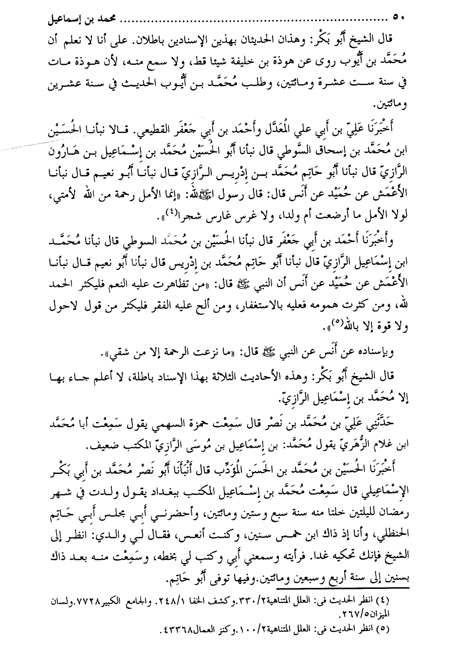 قال الشيخ أبو بكر: وهذه الأحاديث الثلاثة بهذا الإسناد باطلة، لا أعلم جاء بها إلا محمد بن إسماعيل الرازي.