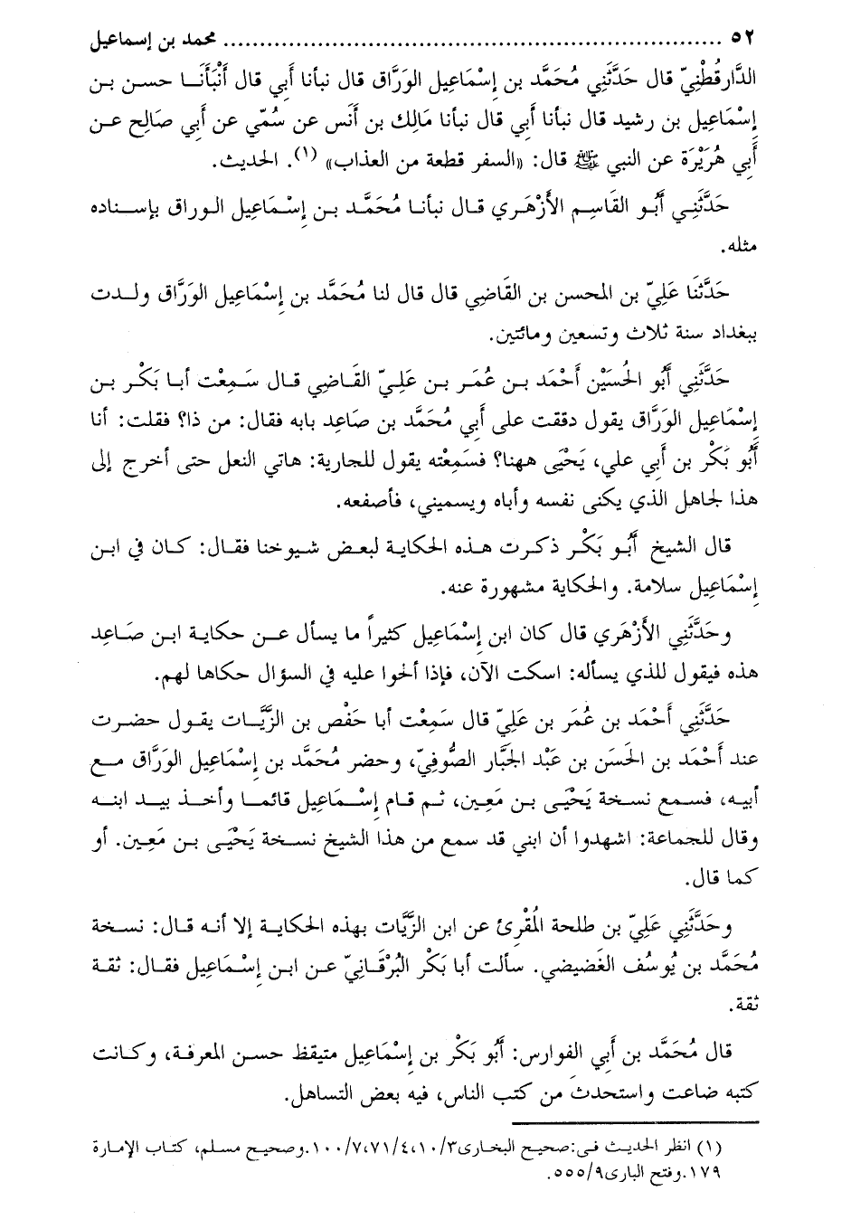 الدَّارَقُطْنِيُّ قَالَ حَدَّثَنِي مُحَمَّدُ بْنُ إِسْمَاعِيلَ الْوَرَّاقُ قَالَ نبأنا أبي قال أنبأنا حسن بن إسماعيل بن رشيد قال نبأنا أبي قال نبأنا مَالِكُ بْنُ أَنَسٍ عَنْ سُمَيٍّ عَنْ أَبِي صَالِحٍ عَنْ أَبِي هُرَيْرَةَ عَنِ النَّبِيِّ صَلَّى اللَّهُ عَلَيْهِ وَسَلَّمَ قَالَ: «السَّفَرُ قِطْعَةٌ مِنَ الْعَذَابِ» [1] . الْحَدِيثَ.
