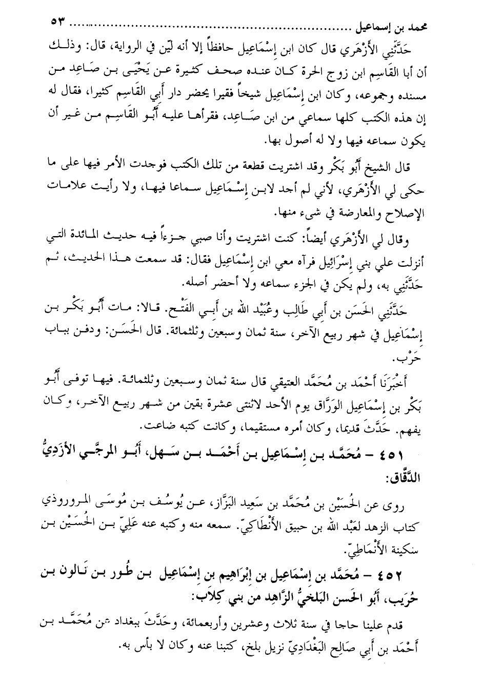 قال الشيخ أبو بكر وقد اشتريت قطعة من تلك الكتب فوجدت الأمر فيها على ما حكى لي الأزهري، لأني لم أجد لابن إسماعيل سماعا فيها، ولا رأيت علامات الإصلاح والمعارضة في شيء منها.