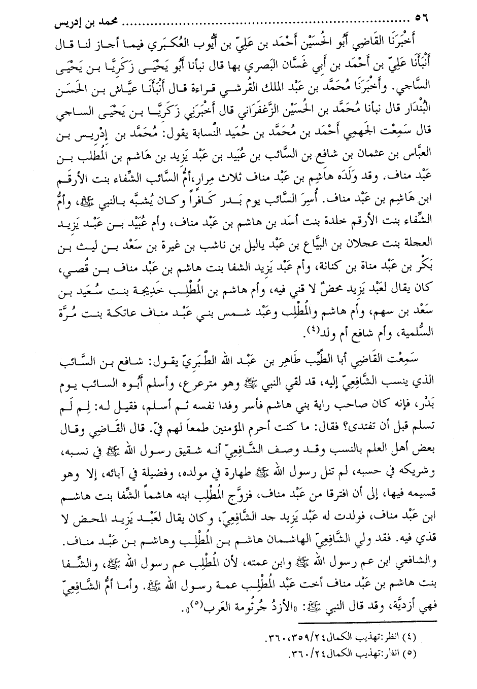 أَخْبَرَنَا الْقَاضِي أَبُو الْحُسَيْنِ أَحْمَدُ بْنُ عَلِيِّ بْنِ أَيُّوبَ العكبري فيما أجاز لنا قَالَ أنبأنا عَلِيّ بن أَحْمَدَ بْنِ أَبِي غسان البصري بها قال نبأنا أبو يحيى زكريا بن يحيى الساجي. وَأَخْبَرَنَا محمد بن عبد الملك القرشي قراءة قَالَ أنبأنا عيّاش بن الحسن البندار قال نبأنا مُحَمَّدُ بْنُ الْحُسَيْنِ الزعفراني قَالَ أَخْبَرَنِي زكريا بن يحيى الساجي قَالَ سمعت الجهمي أحمد بن محمد بن حميد النسابة يقول: محمد بن إدريس بن العباس بن عثمان بن شافع بن السائب بن عبيد بن عبد يزيد بن هاشم بن المطلب بن عبد مناف. وقد ولده هاشم بن عبد مناف ثلاث مرار، أمّ السّائب الشّفاء بنت الأرقم ابن هاشم بن عبد مناف. أسر السائب يوم بدر كافرا وكان يشبه بالنبي صَلَّى اللَّهُ عليه وسلّم، وأمّ الشّفاء بنت الأرقم خلدة بنت أسد بن هاشم بن عبد مناف، وأم عبيد بن عبد يزيد العجلة بنت عجلان بن البياع بن عبد يا ليل بن ناشب بن غيرة بن سعد بن ليث بن بكر بن عبد مناة بن كنانة، وأم عبد يزيد الشفا بنت هاشم بن عبد مناف بن قصي، كان يقال لعبد يزيد محض لا قني فيه، وأم هاشم بن المطلب خديجة بنت سعيد بن سعد بن سهم، وأم هاشم والمطلب وعبد شمس بنى عبد مناف عاتكة بنت مرة السلمية، وأم شافع أم ولد [1] .