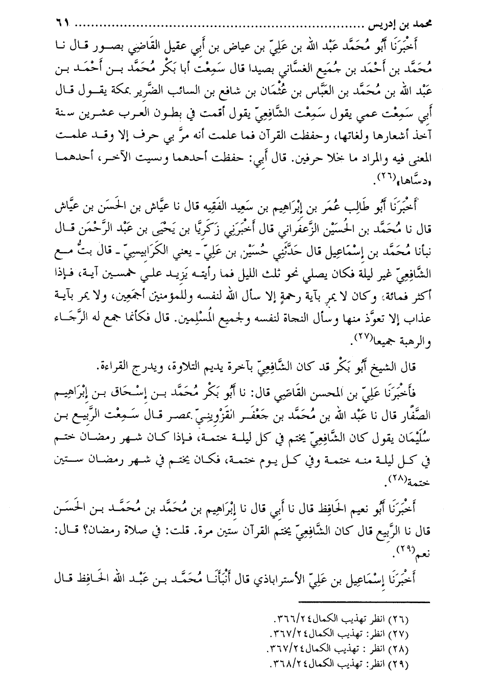فأخبرنا علي بن المحسن القاضي قَالَ: نا أَبُو بَكْر مُحَمَّد بْن إِسْحَاق بْن إِبْرَاهِيم الصفار قَالَ نا عَبْدُ اللَّهِ بْنُ مُحَمَّدِ بْنِ جَعْفَرٍ الْقَزْوِينِيُّ بِمصر قَالَ سمعتُ الربيع بْن سُلَيْمَان يَقُولُ كان الشافعي يختم في كل ليلة ختمة، فإذا كان شهر رمضان ختم في كل ليلة منه ختمة وفي كل يوم ختمة، فكان يختم في شهر رمضان ستين ختمة [3] .