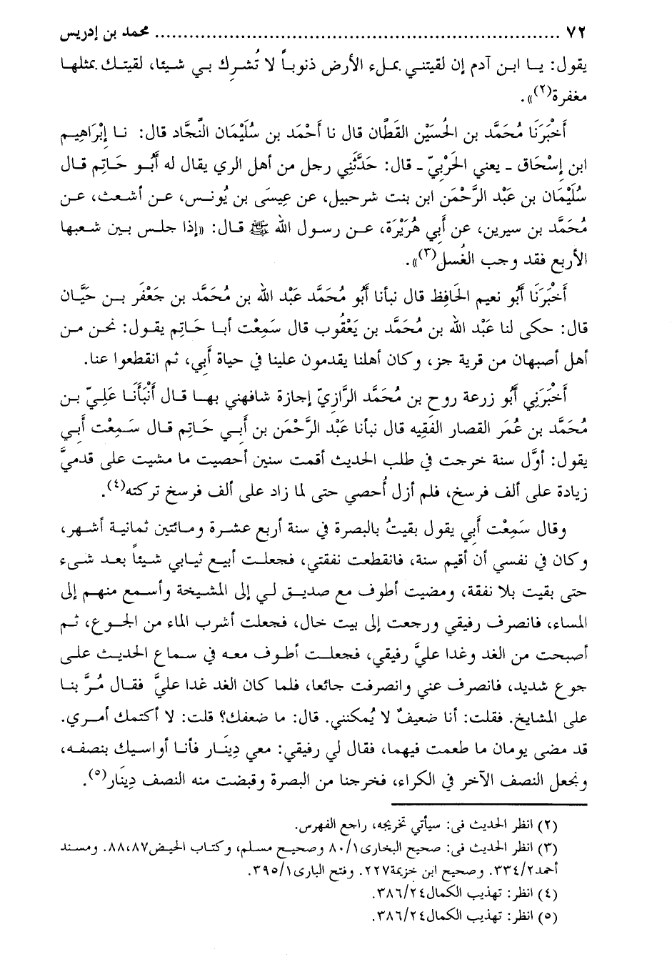 أَخْبَرَنِي أَبُو زرعة روح بْن مُحَمَّد الرازي إجازة شافهني بها قال أنبأنا علي بن محمد بن عمر القصار الفقيه قال نبأنا عَبْد الرَّحْمَن بْن أبي حاتِم قَالَ سمعتُ أبي يقول: أول سنة خرجت في طلب الحديث أقمت سنين أحصيت ما مشيت على قدميّ زيادة على ألف فرسخ، فلم أزل أحصى حتى لما زاد على ألف فرسخ تركته [3] .
