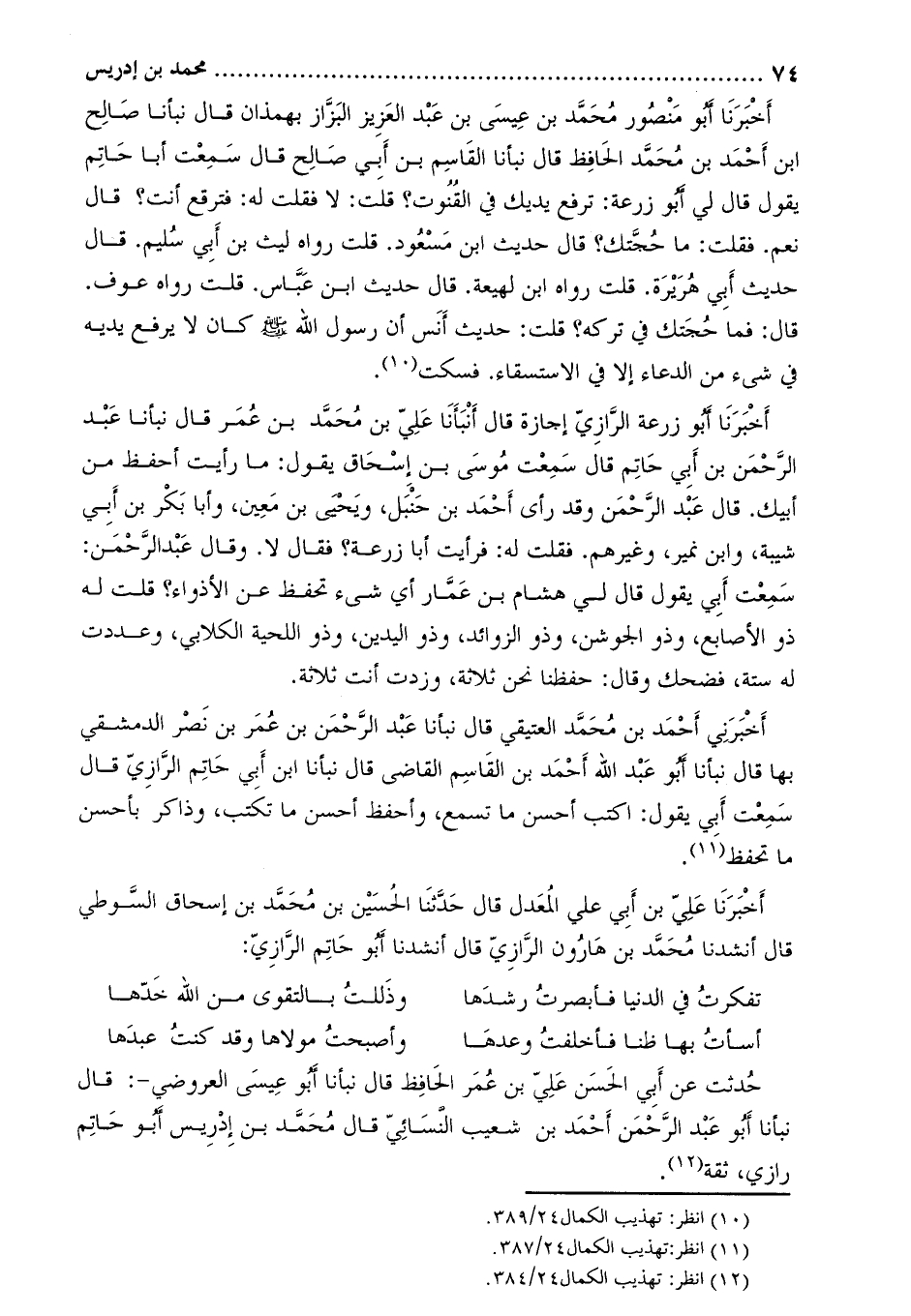 حدثت عن أبي الحسن علي بن عمر الحافظ قال نبأنا أبو عيسى العروضي-: قال نبأنا أَبُو عَبْد الرَّحْمَن أَحْمَد بْن شُعَيْبٍ النَّسَائِيُّ قَالَ محمد بن إدريس أبو حاتم رازي، ثقة [3] .