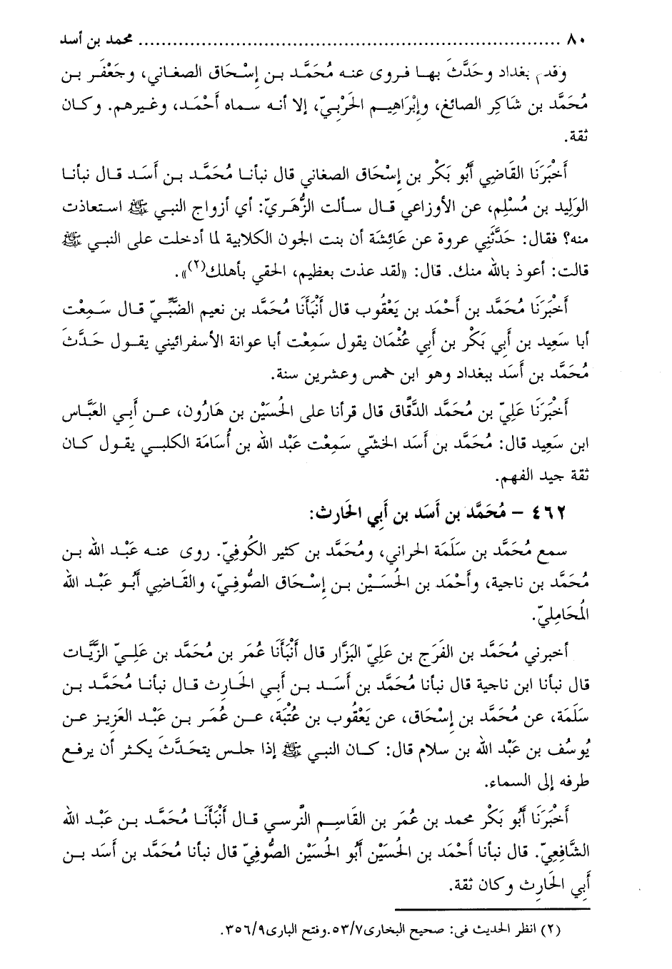 أَخْبَرَنَا أَبُو بَكْر مُحَمَّدُ بْنُ عُمَرَ بْنِ الْقَاسِمِ النَّرْسِيُّ قَالَ أنبأنا محمّد بن عبد الله الشّافعيّ. قال نبأنا أحمد بن الحسين أبو الحسين الصّوفيّ قال نبأنا محمد بن أسد بن أبي الحارث وكان ثقة.