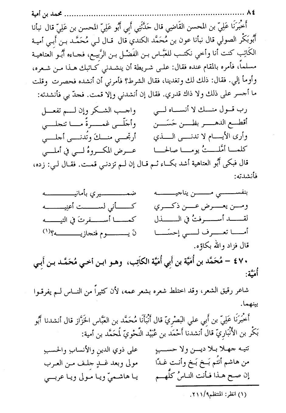 أَخْبَرَنَا عَلِيّ بن المحسن الْقَاضِي قَالَ حَدَّثَنِي أبي أبو علي المحسن بن علي قَالَ نبأنا أبو بكر الصولي قال نبأنا عون بن محمد الكندي قَالَ قَالَ لي محمد بن أبي أمية الكاتب كنت أنا وأخي نكتب للعباس بن الفضل بن الربيع، فجاءه أبو العتاهية مسلما، فأمره بالمقام عنده فقال: على شريطة أن ينشدني كاتبك هذا من شعره، وأومأ إلي. فقال: ذلك لك وتغدينا، فقال الشرط؟ فأمرني أن أنشده فحصرت وقلت ما أجسر على ذلك ولا ذاك قدري. فقال إن أنشدني وإلا قمت. فجد بي فأنشدته: