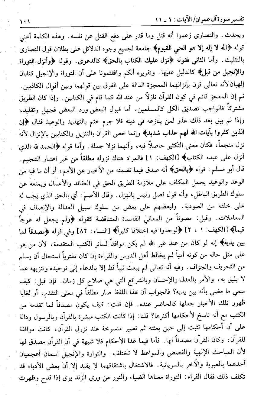 ويحدث. والنصارى زعموا أنه قتل وما قدر على دفع القتل عن نفسه. وهذه الكلمة أعني قوله اللَّهُ لا إِلهَ إِلَّا هُوَ الْحَيُّ الْقَيُّومُ جامعة لجميع وجوه الدلائل على بطلان قول النصارى بالتثليث. وأما الثاني فقوله نَزَّلَ عَلَيْكَ الْكِتابَ بِالْحَقِّ كالدعوى. وقوله وَأَنْزَلَ التَّوْراةَ وَالْإِنْجِيلَ مِنْ قَبْلُ كالدليل عليها. وتقريره أنكم وافقتمونا على أن التوراة والإنجيل كتابان إلهيان لأنه تعالى قرن بإنزالهما المعجزة الدالة على الفرق بين قولهما وبين أقوال الكاذبين.