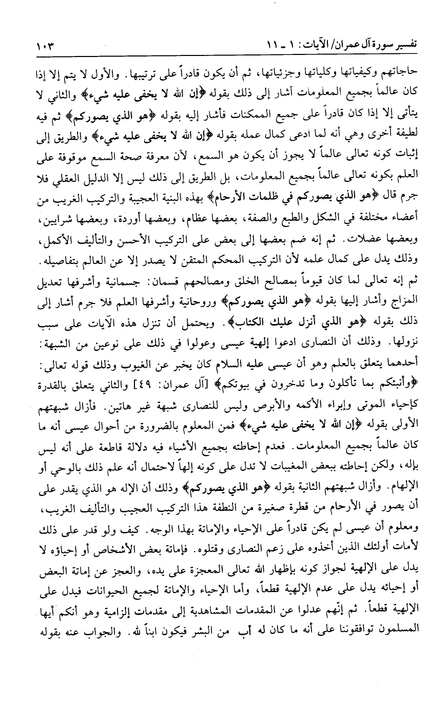 وَأُنَبِّئُكُمْ بِما تَأْكُلُونَ وَما تَدَّخِرُونَ فِي بُيُوتِكُمْ [آل عمران: 49] والثاني يتعلق بالقدرة كإحياء الموتى وإبراء الأكمه والأبرص وليس للنصارى شبهة غير هاتين. فأزال شبهتهم الأولى بقوله إِنَّ اللَّهَ لا يَخْفى عَلَيْهِ شَيْءٌ فمن المعلوم بالضرورة من أحوال عيسى أنه ما كان عالما بجميع المعلومات. فعدم إحاطته بجميع الأشياء فيه دلالة قاطعة على أنه ليس بإله، ولكن إحاطته ببعض المغيبات لا تدل على كونه إلها لاحتمال أنه علم ذلك بالوحي أو الإلهام. وأزال شبهتهم الثانية بقوله هُوَ الَّذِي يُصَوِّرُكُمْ وذلك أن الإله هو الذي يقدر على أن يصور في الأرحام من قطرة صغيرة من النطفة هذا التركيب العجيب والتأليف الغريب، ومعلوم أن عيسى لم يكن قادرا على الإحياء والإماتة بهذا الوجه. كيف ولو قدر على ذلك لأمات أولئك الذين أخذوه على زعم النصارى وقتلوه. فإماتة بعض الأشخاص أو إحياؤه لا يدل على الإلهية لجواز كونه بإظهار الله تعالى المعجزة على يده، والعجز عن إماتة البعض أو إحيائه يدل على عدم الإلهية قطعا، وأما الإحياء والإماتة لجميع الحيوانات فيدل على الإلهية قطعا. ثم إنّهم عدلوا عن المقدمات المشاهدية إلى مقدمات إلزامية وهو أنكم أيها المسلمون توافقوننا على أنه ما كان له أب من البشر فيكون ابنا لله. والجواب عنه بقوله