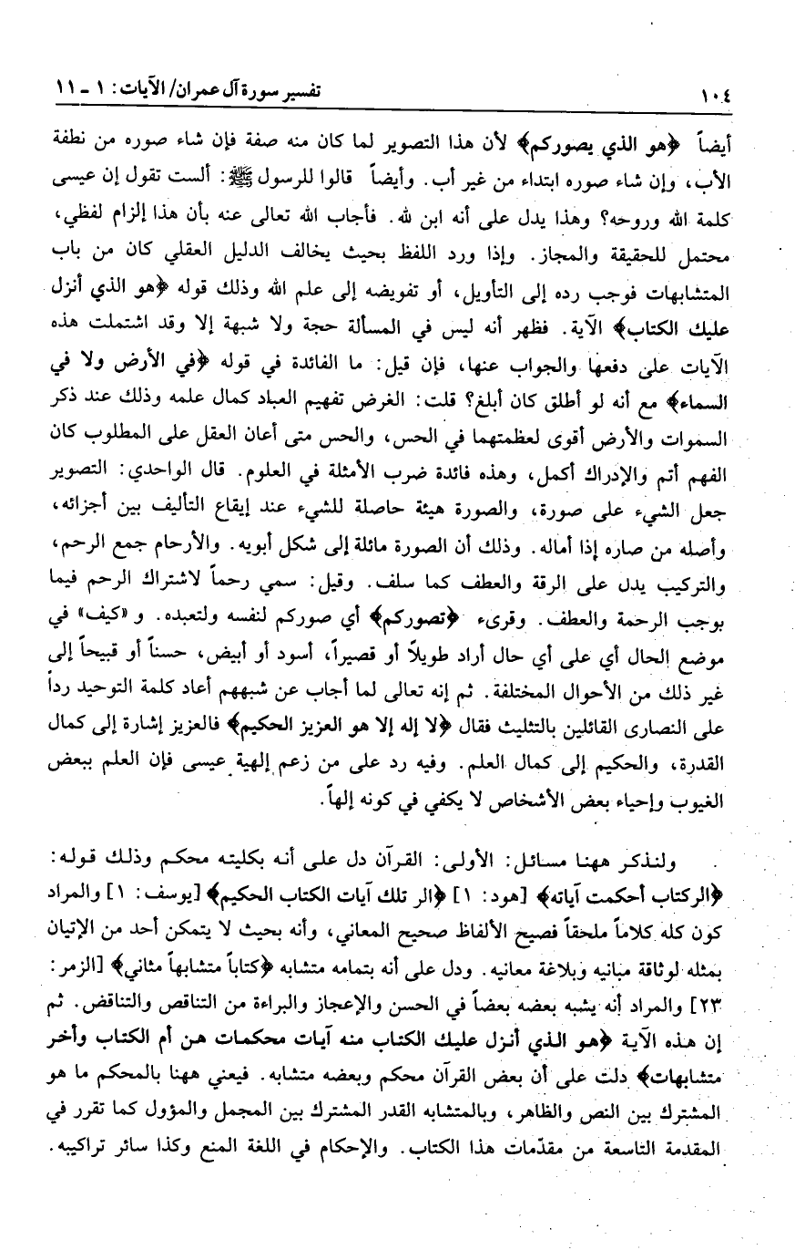 أيضا هُوَ الَّذِي يُصَوِّرُكُمْ لأن هذا التصوير لما كان منه صفة فإن شاء صوره من نطفة الأب، وإن شاء صوره ابتداء من غير أب. وأيضا قالوا للرسول صلى الله عليه وسلم: ألست تقول إن عيسى كلمة الله وروحه؟ وهذا يدل على أنه ابن لله. فأجاب الله تعالى عنه بأن هذا إلزام لفظي، محتمل للحقيقة والمجاز. وإذا ورد اللفظ بحيث يخالف الدليل العقلي كان من باب المتشابهات فوجب رده إلى التأويل، أو تفويضه إلى علم الله وذلك قوله هُوَ الَّذِي أَنْزَلَ عَلَيْكَ الْكِتابَ الآية. فظهر أنه ليس في المسألة حجة ولا شبهة إلا وقد اشتملت هذه الآيات على دفعها والجواب عنها، فإن قيل: ما الفائدة في قوله فِي الْأَرْضِ وَلا فِي السَّماءِ مع أنه لو أطلق كان أبلغ؟ قلت: الغرض تفهيم العباد كمال علمه وذلك عند ذكر السموات والأرض أقوى لعظمتهما في الحس، والحس متى أعان العقل على المطلوب كان الفهم أتم والإدراك أكمل، وهذه فائدة ضرب الأمثلة في العلوم. قال الواحدي: التصوير جعل الشيء على صورة، والصورة هيئة حاصلة للشيء عند إيقاع التأليف بين أجزائه، وأصله من صاره إذا أماله. وذلك أن الصورة مائلة إلى شكل أبويه. والأرحام جمع الرحم، والتركيب يدل على الرقة والعطف كما سلف. وقيل: سمي رحما لاشتراك الرحم فيما يوجب الرحمة والعطف. وقرىء تصوركم أي صوركم لنفسه ولتعبده. و «كيف» في موضع الحال أي على أي حال أراد طويلا أو قصيرا، أسود أو أبيض، حسنا أو قبيحا إلى غير ذلك من الأحوال المختلفة. ثم إنه تعالى لما أجاب عن شبههم أعاد كلمة التوحيد ردا على النصارى القائلين بالتثليث فقال لا إِلهَ إِلَّا هُوَ الْعَزِيزُ الْحَكِيمُ فالعزيز إشارة إلى كمال القدرة، والحكيم إلى كمال العلم. وفيه رد على من زعم إلهية عيسى فإن العلم ببعض الغيوب وإحياء بعض الأشخاص لا يكفي في كونه إلها.