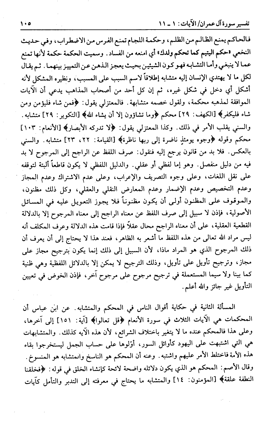 والسني يقلب الأمر في ذلك. وكذا المعتزلي يقول: لا تُدْرِكُهُ الْأَبْصارُ [الأنعام: 103] محكم وقوله وُجُوهٌ يَوْمَئِذٍ ناضِرَةٌ إِلى رَبِّها ناظِرَةٌ [القيامة: 22، 23] متشابه. والسني بالعكس. فلا بد من قانون يرجع إليه فنقول: صرف اللفظ عن الراجح إلى المرجوح لا بد فيه من دليل منفصل. وهو إما لفظي أو عقلي. والدليل اللفظي لا يكون قاطعا البتة لتوقفه على نقل اللغات، وعلى وجوه التصريف والإعراب، وعلى عدم الاشتراك وعدم المجاز وعدم التخصيص وعدم الإضمار وعدم المعارض النقلي والعقلي، وكل ذلك مظنون، والموقوف على المظنون أولى أن يكون مظنونا فلا يجوز التعويل عليه في المسائل الأصولية، فإذن لا سبيل إلى صرف اللفظ عن معناه الراجح إلى معناه المرجوح إلا بالدلالة القطعية العقلية، على أن معناه الراجح محال عقلا فإذا قامت هذه الدلالة وعرف المكلف أنه ليس مراد الله تعالى من هذه اللفظ ما أشعر به الظاهر، فعند هذا لا يحتاج إلى أن يعرف أن ذلك المرجوح الذي هو المراد ماذا، لأن السبيل إلى ذلك إنما يكون بترجيح مجاز على مجاز، وترجيح تأويل على تأويل، وذلك الترجيح لا يمكن إلا بالدلائل اللفظية وهي ظنية كما بينا ولا سيما المستعملة في ترجيح مرجوح على مرجوح آخر، فإذن الخوض في تعيين التأويل غير جائز والله أعلم.