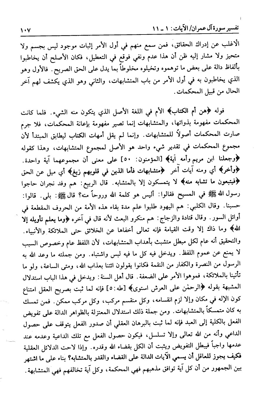 الأغلب عن إدراك الحقائق، فمن سمع منهم في أول الأمر إثبات موجود ليس بجسم ولا متحيز ولا مشار إليه ظن أن هذا عدم ونفي فوقع في التعطيل، فكان الأصلح أن يخاطبوا بألفاظ دالة على بعض ما توهموه وتخيلوه مخلوطا بما يدل على الحق الصريح. فالأول وهو الذي يخاطبون به في أول الأمر من باب المتشابهات، والثاني وهو الذي يكشف لهم آخر الحال من قبيل المحكمات.