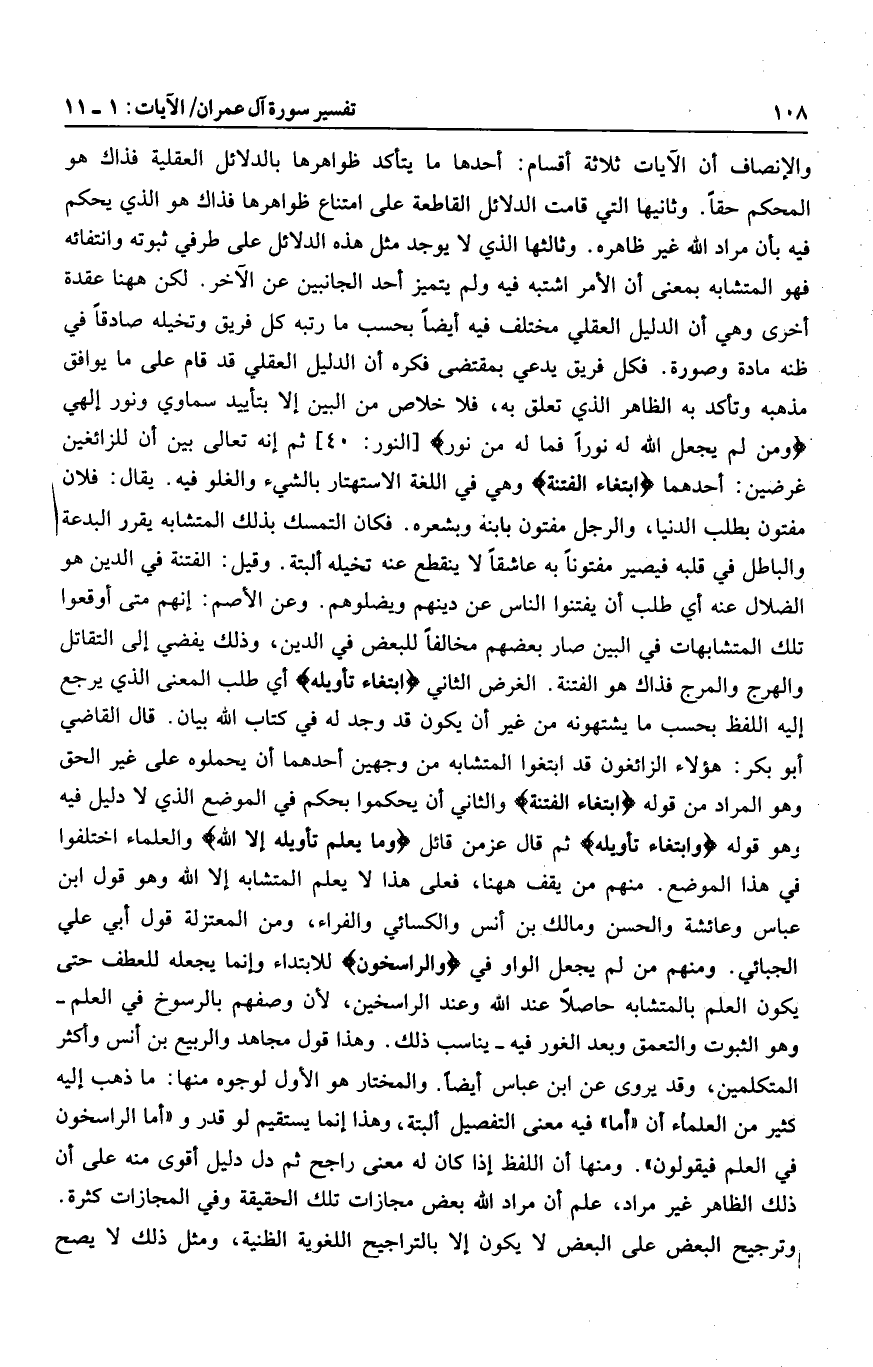 والإنصاف أن الآيات ثلاثة أقسام: أحدها ما يتأكد ظواهرها بالدلائل العقلية فذاك هو المحكم حقا. وثانيها التي قامت الدلائل القاطعة على امتناع ظواهرها فذاك هو الذي يحكم فيه بأن مراد الله غير ظاهره. وثالثها الذي لا يوجد مثل هذه الدلائل على طرفي ثبوته وانتفائه فهو المتشابه بمعنى أن الأمر اشتبه فيه ولم يتميز أحد الجانبين عن الآخر. لكن هاهنا عقدة أخرى وهي أن الدليل العقلي مختلف فيه أيضا بحسب ما رتبه كل فريق وتخيله صادقا في ظنه مادة وصورة. فكل فريق يدعي بمقتضى فكره أن الدليل العقلي قد قام على ما يوافق مذهبه وتأكد به الظاهر الذي تعلق به، فلا خلاص من البين إلا بتأييد سماوي ونور إلهي وَمَنْ لَمْ يَجْعَلِ اللَّهُ لَهُ نُوراً فَما لَهُ مِنْ نُورٍ [النور: 40] ثم إنه تعالى بين أن للزائغين غرضين: أحدهما ابْتِغاءَ الْفِتْنَةِ وهي في اللغة الاستهتار بالشيء والغلو فيه. يقال: فلان مفتون بطلب الدنيا، والرجل مفتون بابنه وبشعره. فكان التمسك بذلك المتشابه يقرر البدعة والباطل في قلبه فيصير مفتونا به عاشقا لا ينقطع عنه تخيله البتة. وقيل: الفتنة في الدين هو الضلال عنه أي طلب أن يفتنوا الناس عن دينهم ويضلوهم. وعن الأصم: إنهم متى أوقعوا تلك المتشابهات في البين صار بعضهم مخالفا للبعض في الدين، وذلك يفضي إلى التقاتل والهرج والمرج فذاك هو الفتنة. الغرض الثاني ابْتِغاءَ تَأْوِيلِهِ أي طلب المعنى الذي يرجع إليه اللفظ بحسب ما يشتهونه من غير أن يكون قد وجد له في كتاب الله بيان. قال القاضي أبو بكر: هؤلاء الزائغون قد ابتغوا المتشابه من وجهين أحدهما أن يحملوه على غير الحق وهو المراد من قوله ابْتِغاءَ الْفِتْنَةِ والثاني أن يحكموا بحكم في الموضع الذي لا دليل فيه وهو قوله وَابْتِغاءَ تَأْوِيلِهِ ثم قال عزمن قائل وَما يَعْلَمُ تَأْوِيلَهُ إِلَّا اللَّهُ والعلماء اختلفوا في هذا الموضع. منهم من يقف هاهنا، فعلى هذا لا يعلم المتشابه إلا الله وهو قول ابن عباس وعائشة والحسن ومالك بن أنس والكسائي والفراء، ومن المعتزلة قول أبي علي الجبائي. ومنهم من لم يجعل الواو في وَالرَّاسِخُونَ للابتداء وإنما يجعله للعطف حتى يكون العلم بالمتشابه حاصلا عند الله وعند الراسخين، لأن وصفهم بالرسوخ في العلم- وهو الثبوت والتعمق وبعد الغور فيه- يناسب ذلك. وهذا قول مجاهد والربيع بن أنس وأكثر المتكلمين، وقد يروى عن ابن عباس أيضا. والمختار هو الأول لوجوه منها: ما ذهب إليه كثير من العلماء أن «أما» فيه معنى التفصيل البتة، وهذا إنما يستقيم لو قدر و «أما الراسخون في العلم فيقولون» . ومنها أن اللفظ إذا كان له معنى راجح ثم دل دليل أقوى منه على أن ذلك الظاهر غير مراد، علم أن مراد الله بعض مجازات تلك الحقيقة وفي المجازات كثرة.