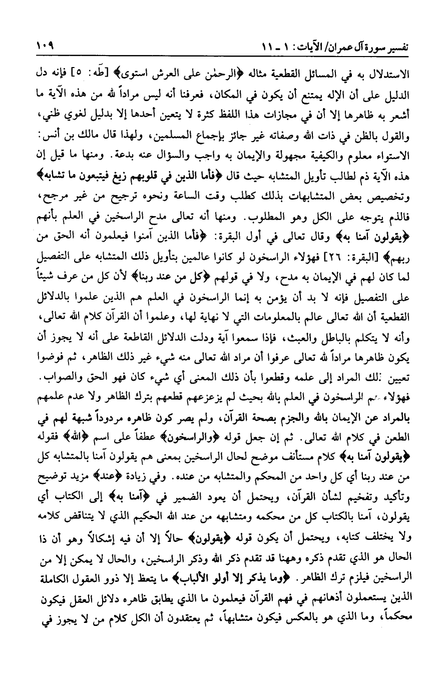 الاستواء معلوم والكيفية مجهولة والإيمان به واجب والسؤال عنه بدعة. ومنها ما قيل إن هذه الآية ذم لطالب تأويل المتشابه حيث قال فَأَمَّا الَّذِينَ فِي قُلُوبِهِمْ زَيْغٌ فَيَتَّبِعُونَ ما تَشابَهَ وتخصيص بعض المتشابهات بذلك كطلب وقت الساعة ونحوه ترجيح من غير مرجح، فالذم يتوجه على الكل وهو المطلوب. ومنها أنه تعالى مدح الراسخين في العلم بأنهم يَقُولُونَ آمَنَّا بِهِ وقال تعالى في أول البقرة: فَأَمَّا الَّذِينَ آمَنُوا فَيَعْلَمُونَ أَنَّهُ الْحَقُّ مِنْ رَبِّهِمْ [البقرة: 26] فهؤلاء الراسخون لو كانوا عالمين بتأويل ذلك المتشابه على التفصيل لما كان لهم في الإيمان به مدح، ولا في قولهم كُلٌّ مِنْ عِنْدِ رَبِّنا لأن كل من عرف شيئا على التفصيل فإنه لا بد أن يؤمن به إنما الراسخون في العلم هم الذين علموا بالدلائل القطعية أن الله تعالى عالم بالمعلومات التي لا نهاية لها، وعلموا أن القرآن كلام الله تعالى، وأنه لا يتكلم بالباطل والعبث، فإذا سمعوا آية ودلت الدلائل القاطعة على أنه لا يجوز أن يكون ظاهرها مرادا لله تعالى عرفوا أن مراد الله تعالى منه شيء غير ذلك الظاهر، ثم فوضوا تعيين ذلك المراد إلى علمه وقطعوا بأن ذلك المعنى أي شيء كان فهو الحق والصواب.