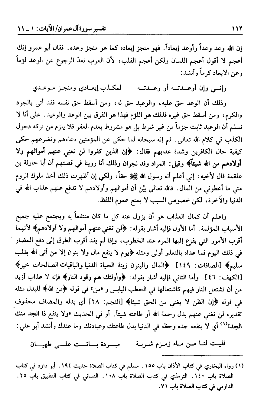 وذلك أن الوعد حق عليه، والوعيد حق له، ومن أسقط حق نفسه فقد أتى بالجود والكرم، ومن أسقط حق غيره فذلك هو اللؤم فهذا هو الفرق بين الوعد والوعيد. على أنا لا نسلم أن الوعيد ثابت جزما من غير شرط بل هو مشروط بعدم العفو فلا يلزم من تركه دخول الكذب في كلام الله تعالى. ثم إنه سبحانه لما حكى عن المؤمنين دعاءهم وتضرعهم حكى كيفية حال الكافرين وشدة عذابهم فقال: إِنَّ الَّذِينَ كَفَرُوا لَنْ تُغْنِيَ عَنْهُمْ أَمْوالُهُمْ وَلا أَوْلادُهُمْ مِنَ اللَّهِ شَيْئاً وقيل: المراد وفد نجران وذلك أنا روينا في قصتهم أن أبا حارثة بن علقمة قال لأخيه: إني أعلم أنه رسول الله صلى الله عليه وسلم حقا، ولكي إن أظهرت ذلك أخذ ملوك الروم مني ما أعطوني من المال. فالله تعالى بيّن أن أموالهم وأولادهم لا تدفع عنهم عذاب الله في الدنيا والآخرة، لكن خصوص السبب لا يمنع عموم اللفظ.