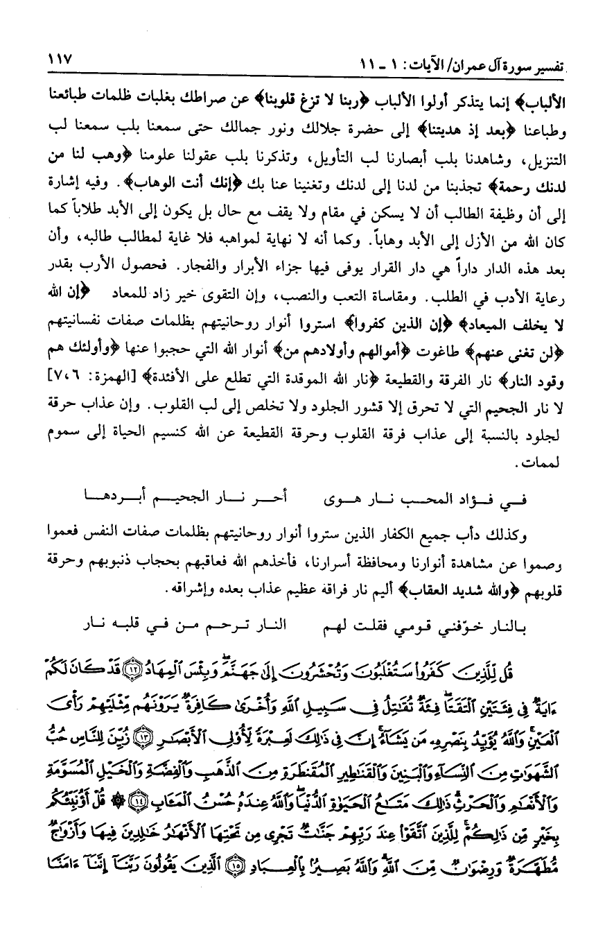 إنما يتذكر أولوا الألباب رَبَّنا لا تُزِغْ قُلُوبَنا عن صراطك بغلبات ظلمات طبائعنا وطباعنا بَعْدَ إِذْ هَدَيْتَنا إلى حضرة جلالك ونور جمالك حتى سمعنا بلب سمعنا لب التنزيل، وشاهدنا بلب أبصارنا لب التأويل، وتذكرنا بلب عقولنا علومنا وَهَبْ لَنا مِنْ لَدُنْكَ رَحْمَةً تجذبنا من لدنا إلى لدنك وتغنينا عنا بك إِنَّكَ أَنْتَ الْوَهَّابُ. وفيه إشارة إلى أن وظيفة الطالب أن لا يسكن في مقام ولا يقف مع حال بل يكون إلى الأبد طلابا كما كان الله من الأزل إلى الأبد وهابا. وكما أنه لا نهاية لمواهبه فلا غاية لمطالب طالبه، وأن بعد هذه الدار دارا هي دار القرار يوفى فيها جزاء الأبرار والفجار. فحصول الأرب بقدر رعاية الأدب في الطلب. ومقاساة التعب والنصب، وإن التقوى خير زاد للمعاد إِنَّ اللَّهَ لا يُخْلِفُ الْمِيعادَ إِنَّ الَّذِينَ كَفَرُوا استروا أنوار روحانيتهم بظلمات صفات نفسانيتهم لَنْ تُغْنِيَ عَنْهُمْ طاغوت أَمْوالُهُمْ وَلا أَوْلادُهُمْ مِنَ أنوار الله التي حجبوا عنها وَأُولئِكَ هُمْ وَقُودُ النَّارِ نار الفرقة والقطيعة نارُ اللَّهِ الْمُوقَدَةُ الَّتِي تَطَّلِعُ عَلَى الْأَفْئِدَةِ [الهمزة: 6، 7] لا نار الجحيم التي لا تحرق إلا قشور الجلود ولا تخلص إلى لب القلوب. وإن عذاب حرقة لجلود بالنسبة إلى عذاب فرقة القلوب وحرقة القطيعة عن الله كنسيم الحياة إلى سموم لممات.