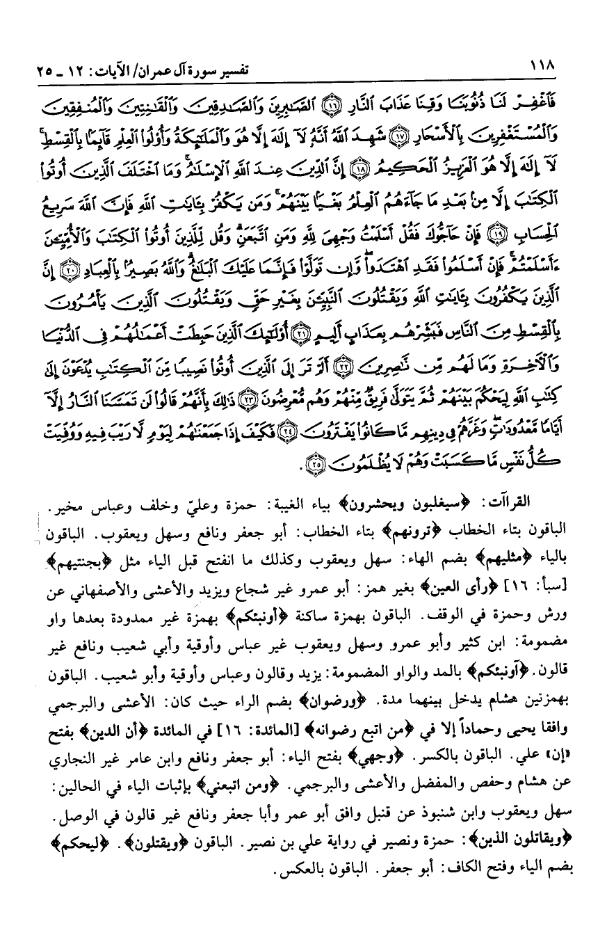 الباقون بتاء الخطاب تَرَوْنَهُمْ بتاء الخطاب: أبو جعفر ونافع وسهل ويعقوب. الباقون بالياء مِثْلَيْهِمْ بضم الهاء: سهل ويعقوب وكذلك ما انفتح قبل الياء مثل بِجَنَّتَيْهِمْ [سبأ: 16] رَأْيَ الْعَيْنِ بغير همز: أبو عمرو غير شجاع ويزيد والأعشى والأصفهاني عن ورش وحمزة في الوقف. الباقون بهمزة ساكنة أَأُنَبِّئُكُمْ بهمزة غير ممدودة بعدها واو مضمومة: ابن كثير وأبو عمرو وسهل ويعقوب غير عباس وأوقية وأبي شعيب ونافع غير قالون. آونبئكم بالمد والواو المضمومة: يزيد وقالون وعباس وأوقية وأبو شعيب. الباقون بهمزتين هشام يدخل بينهما مدة. وَرِضْوانٌ بضم الراء حيث كان: الأعشى والبرجمي وافقا يحيى وحمادا إلا في مَنِ اتَّبَعَ رِضْوانَهُ [المائدة: 16] في المائدة إِنَّ الدِّينَ بفتح «إن» علي. الباقون بالكسر. وَجْهِيَ بفتح الياء: أبو جعفر ونافع وابن عامر غير النجاري عن هشام وحفص والمفضل والأعشى والبرجمي. وَمَنِ اتَّبَعَنِي بإثبات الياء في الحالين: