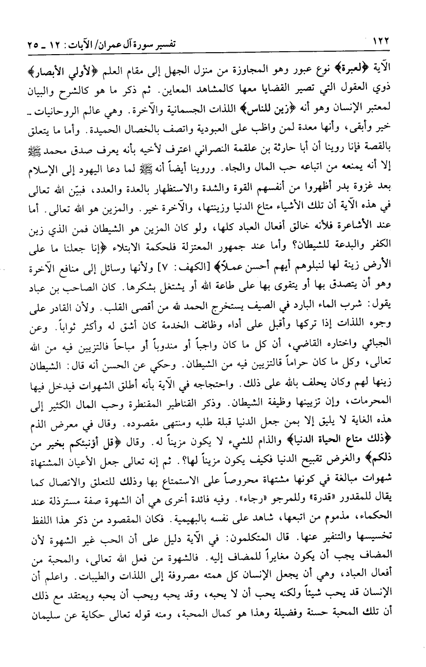 والغرض تقبيح الدنيا فكيف يكون مزينا لها؟. ثم إنه تعالى جعل الأعيان المشتهاة شهوات مبالغة في كونها مشتهاة محروصا على الاستمتاع بها وذلك للتعلق والاتصال كما يقال للمقدور «قدرة» وللمرجو «رجاء» . وفيه فائدة أخرى هي أن الشهوة صفة مسترذلة عند الحكماء، مذموم من اتبعها، شاهد على نفسه بالبهيمية. فكان المقصود من ذكر هذا اللفظ تخسيسها والتنفير عنها. قال المتكلمون: في الآية دليل على أن الحب غير الشهوة لأن المضاف يجب أن يكون مغايرا للمضاف إليه. فالشهوة من فعل الله تعالى، والمحبة من أفعال العباد، وهي أن يجعل الإنسان كل همته مصروفة إلى اللذات والطيبات. واعلم أن الإنسان قد يحب شيئا ولكنه يحب أن لا يحبه، وقد يحبه ويحب أن يحبه ويعتقد مع ذلك أن تلك المحبة حسنة وفضيلة وهذا هو كمال المحبة، ومنه قوله تعالى حكاية عن سليمان