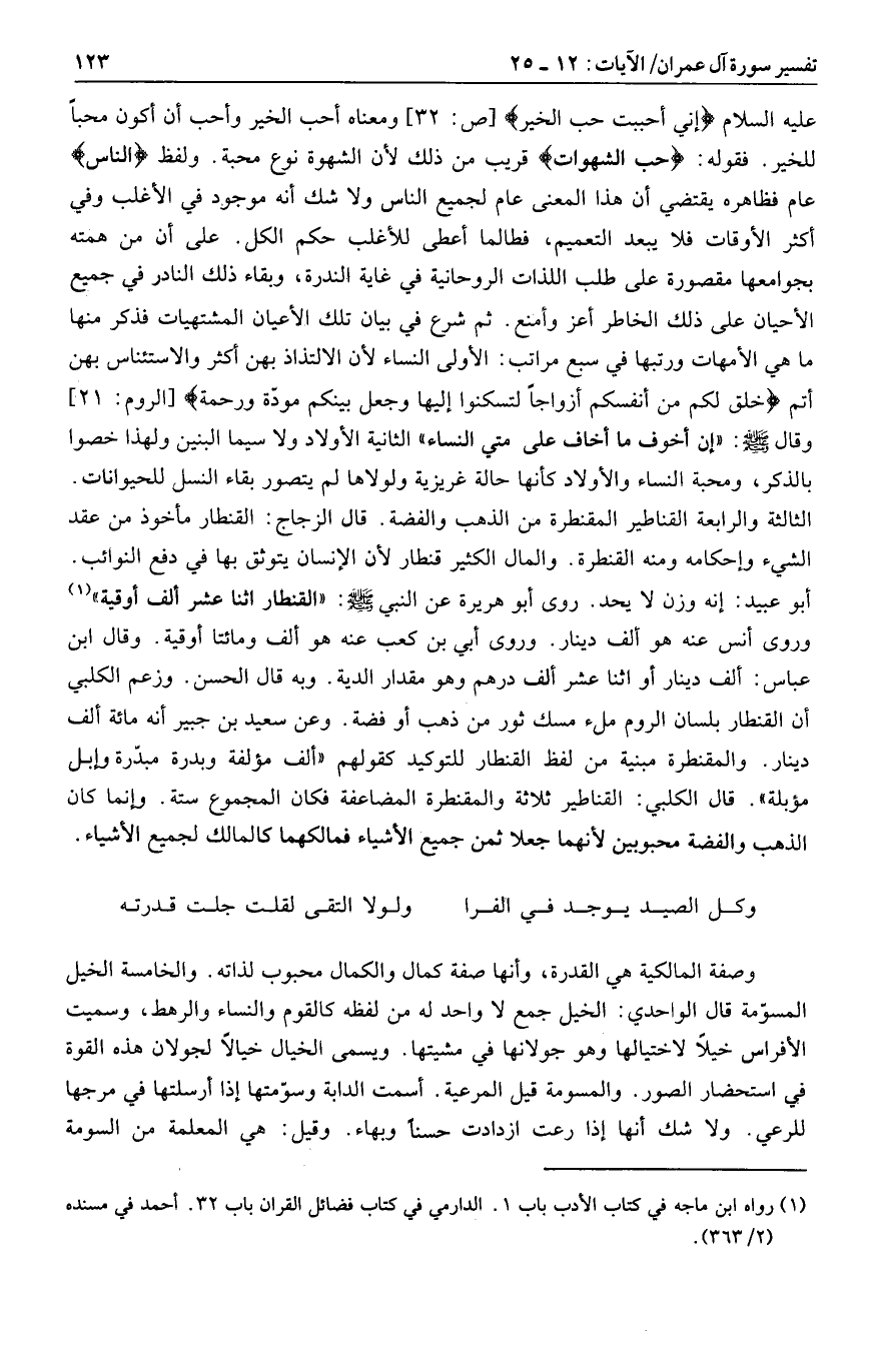 وروى أنس عنه هو ألف دينار. وروى أبي بن كعب عنه هو ألف ومائتا أوقية. وقال ابن عباس: ألف دينار أو اثنا عشر ألف درهم وهو مقدار الدية. وبه قال الحسن. وزعم الكلبي أن القنطار بلسان الروم ملء مسك ثور من ذهب أو فضة. وعن سعيد بن جبير أنه مائة ألف دينار. والمقنطرة مبنية من لفظ القنطار للتوكيد كقولهم «ألف مؤلفة وبدرة مبدّرة وإبل مؤبلة» . قال الكلبي: القناطير ثلاثة والمقنطرة المضاعفة فكان المجموع ستة. وإنما كان الذهب والفضة محبوبين لأنهما جعلا ثمن جميع الأشياء فمالكهما كالمالك لجميع الأشياء.