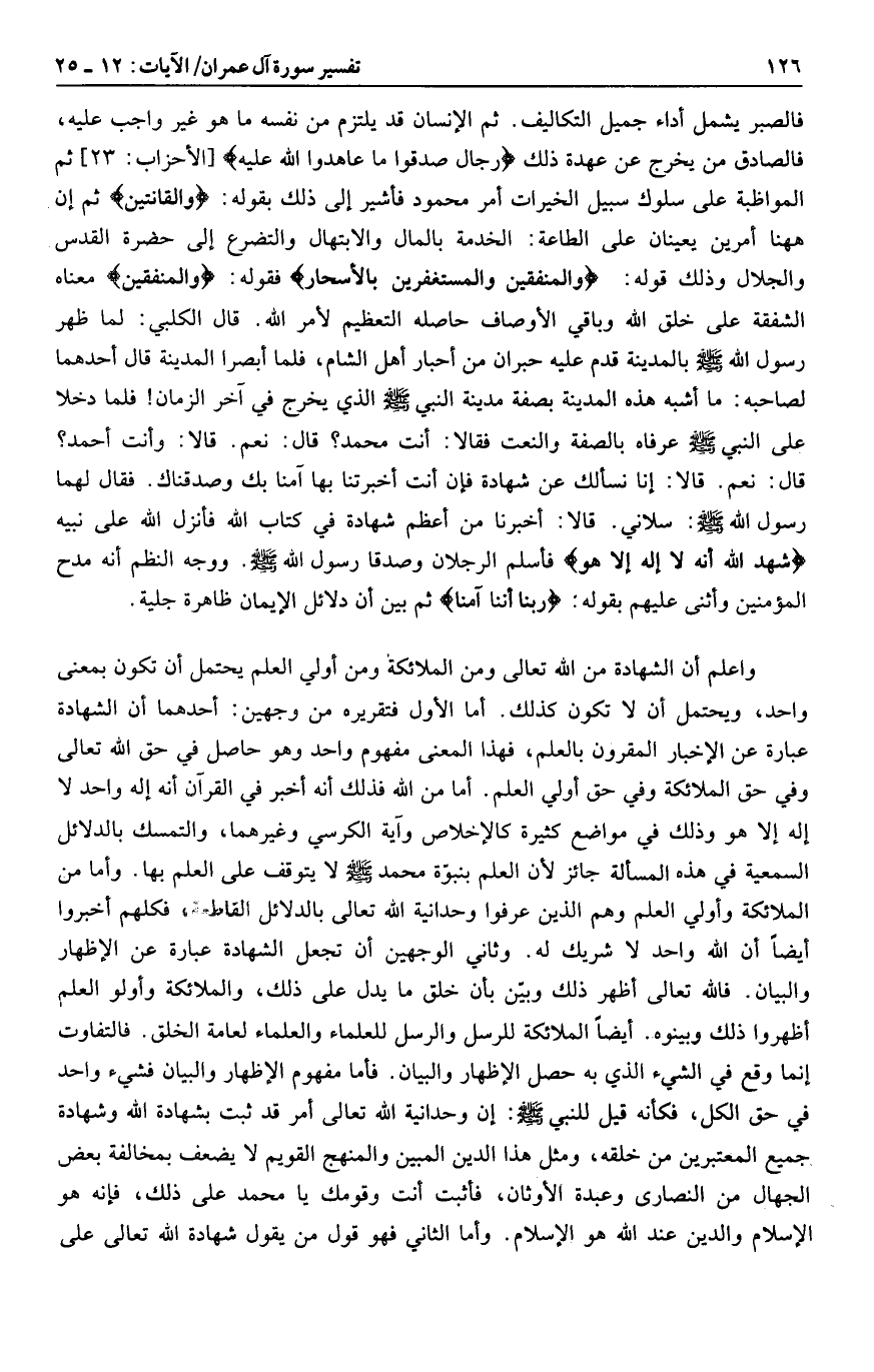 واعلم أن الشهادة من الله تعالى ومن الملائكة ومن أولي العلم يحتمل أن تكون بمعنى واحد، ويحتمل أن لا تكون كذلك. أما الأول فتقريره من وجهين: أحدهما أن الشهادة عبارة عن الإخبار المقرون بالعلم، فهذا المعنى مفهوم واحد وهو حاصل في حق الله تعالى وفي حق الملائكة وفي حق أولي العلم. أما من الله فذلك أنه أخبر في القرآن أنه إله واحد لا إله إلا هو وذلك في مواضع كثيرة كالإخلاص وآية الكرسي وغيرهما، والتمسك بالدلائل السمعية في هذه المسألة جائز لأن العلم بنبوّة محمد صلى الله عليه وسلم لا يتوقف على العلم بها. وأما من الملائكة وأولي العلم وهم الذين عرفوا وحدانية الله تعالى بالدلائل القاطعة، فكلهم أخبروا أيضا أن الله واحد لا شريك له. وثاني الوجهين أن تجعل الشهادة عبارة عن الإظهار والبيان. فالله تعالى أظهر ذلك وبيّن بأن خلق ما يدل على ذلك، والملائكة وأولو العلم أظهروا ذلك وبينوه. أيضا الملائكة للرسل والرسل للعلماء والعلماء لعامة الخلق. فالتفاوت إنما وقع في الشيء الذي به حصل الإظهار والبيان. فأما مفهوم الإظهار والبيان فشيء واحد في حق الكل، فكأنه قيل للنبي صلى الله عليه وسلم: إن وحدانية الله تعالى أمر قد ثبت بشهادة الله وشهادة جميع المعتبرين من خلقه، ومثل هذا الدين المبين والمنهج القويم لا يضعف بمخالفة بعض الجهال من النصارى وعبدة الأوثان، فأثبت أنت وقومك يا محمد على ذلك، فإنه هو الإسلام والدين عند الله هو الإسلام. وأما الثاني فهو قول من يقول شهادة الله تعالى على