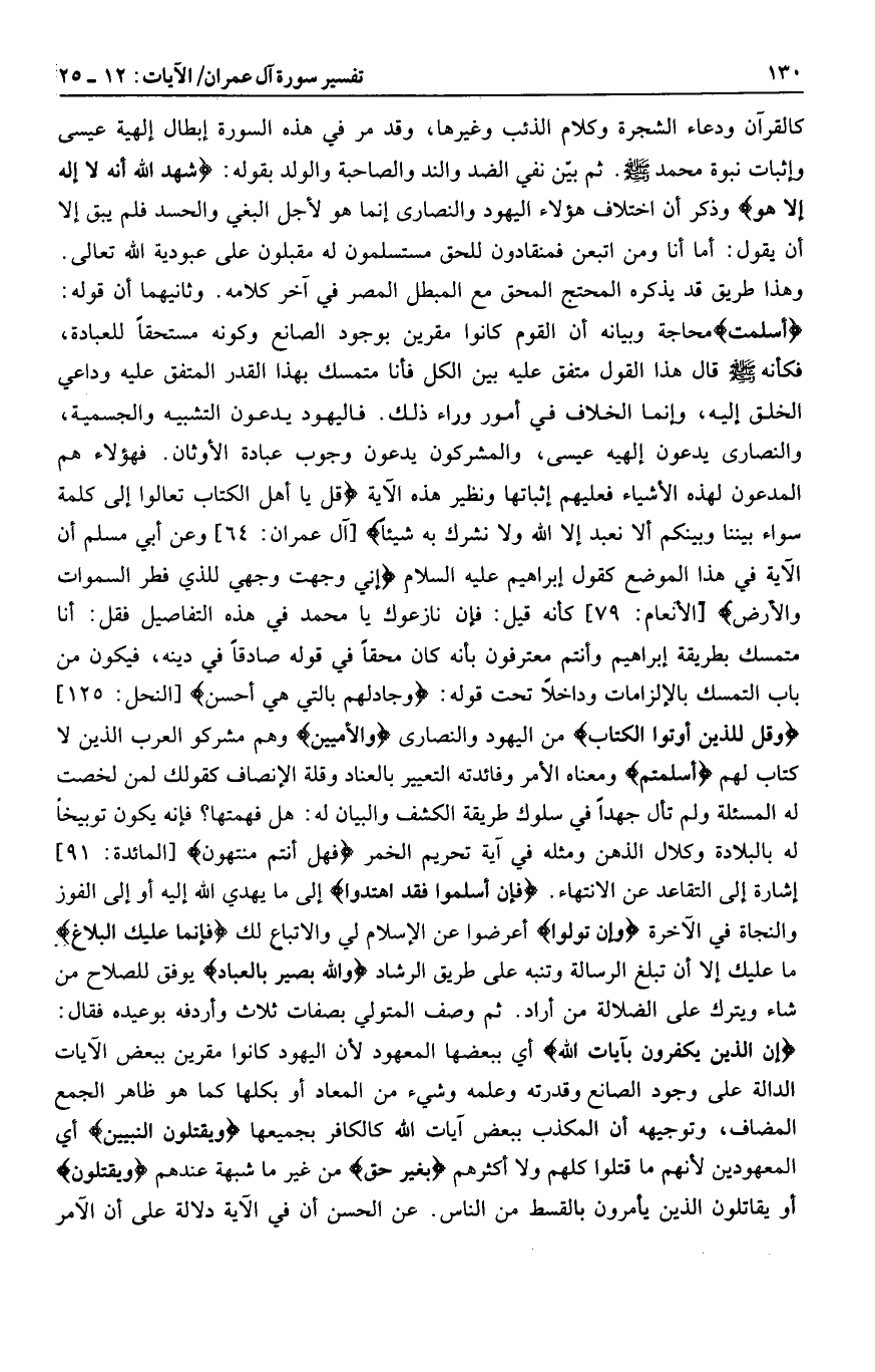 أَسْلَمْتُ محاجة وبيانه أن القوم كانوا مقرين بوجود الصانع وكونه مستحقا للعبادة، فكأنه صلى الله عليه وسلم قال هذا القول متفق عليه بين الكل فأنا متمسك بهذا القدر المتفق عليه وداعي الخلق إليه، وإنما الخلاف في أمور وراء ذلك. فاليهود يدعون التشبيه والجسمية، والنصارى يدعون إلهية عيسى، والمشركون يدعون وجوب عبادة الأوثان. فهؤلاء هم المدعون لهذه الأشياء فعليهم إثباتها ونظير هذه الآية قُلْ يا أَهْلَ الْكِتابِ تَعالَوْا إِلى كَلِمَةٍ سَواءٍ بَيْنَنا وَبَيْنَكُمْ أَلَّا نَعْبُدَ إِلَّا اللَّهَ وَلا نُشْرِكَ بِهِ شَيْئاً [آل عمران: 64] وعن أبي مسلم أن الآية في هذا الموضع كقول إبراهيم عليه السلام إِنِّي وَجَّهْتُ وَجْهِيَ لِلَّذِي فَطَرَ السَّماواتِ وَالْأَرْضَ [الأنعام: 79] كأنه قيل: فإن نازعوك يا محمد في هذه التفاصيل فقل: أنا متمسك بطريقة إبراهيم وأنتم معترفون بأنه كان محقا في قوله صادقا في دينه، فيكون من باب التمسك بالإلزامات وداخلا تحت قوله: وَجادِلْهُمْ بِالَّتِي هِيَ أَحْسَنُ [النحل: 125] وَقُلْ لِلَّذِينَ أُوتُوا الْكِتابَ من اليهود والنصارى وَالْأُمِّيِّينَ وهم مشركو العرب الذين لا كتاب لهم أَسْلَمْتُمْ ومعناه الأمر وفائدته التعيير بالعناد وقلة الإنصاف كقولك لمن لخصت له المسألة ولم تأل جهدا في سلوك طريقة الكشف والبيان له: هل فهمتها؟ فإنه يكون توبيخا له بالبلادة وكلال الذهن ومثله في آية تحريم الخمر فَهَلْ أَنْتُمْ مُنْتَهُونَ [المائدة: 91] إشارة إلى التقاعد عن الانتهاء. فَإِنْ أَسْلَمُوا فَقَدِ اهْتَدَوْا إلى ما يهدي الله إليه أو إلى الفوز والنجاة في الآخرة وَإِنْ تَوَلَّوْا أعرضوا عن الإسلام لي والاتباع لك فَإِنَّما عَلَيْكَ الْبَلاغُ ما عليك إلا أن تبلغ الرسالة وتنبه على طريق الرشاد وَاللَّهُ بَصِيرٌ بِالْعِبادِ يوفق للصلاح من شاء ويترك على الضلالة من أراد. ثم وصف المتولي بصفات ثلاث وأردفه بوعيده فقال:
