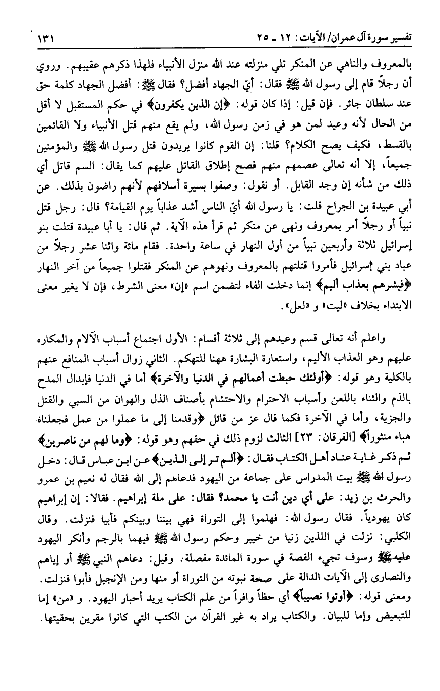 واعلم أنه تعالى قسم وعيدهم إلى ثلاثة أقسام: الأول اجتماع أسباب الآلام والمكاره عليهم وهو العذاب الأليم، واستعارة البشارة هاهنا للتهكم. الثاني زوال أسباب المنافع عنهم بالكلية وهو قوله: أُولئِكَ الَّذِينَ حَبِطَتْ أَعْمالُهُمْ فِي الدُّنْيا وَالْآخِرَةِ أما في الدنيا فإبدال المدح بالذم والثناء باللعن وأسباب الاحترام والاحتشام بأصناف الذل والهوان من السبي والقتل والجزية، وأما في الآخرة فكما قال عز من قائل وَقَدِمْنا إِلى ما عَمِلُوا مِنْ عَمَلٍ فَجَعَلْناهُ هَباءً مَنْثُوراً [الفرقان: 23] الثالث لزوم ذلك في حقهم وهو قوله: وَما لَهُمْ مِنْ ناصِرِينَ ثم ذكر غاية عناد أهل الكتاب فقال: أَلَمْ تَرَ إِلَى الَّذِينَ
