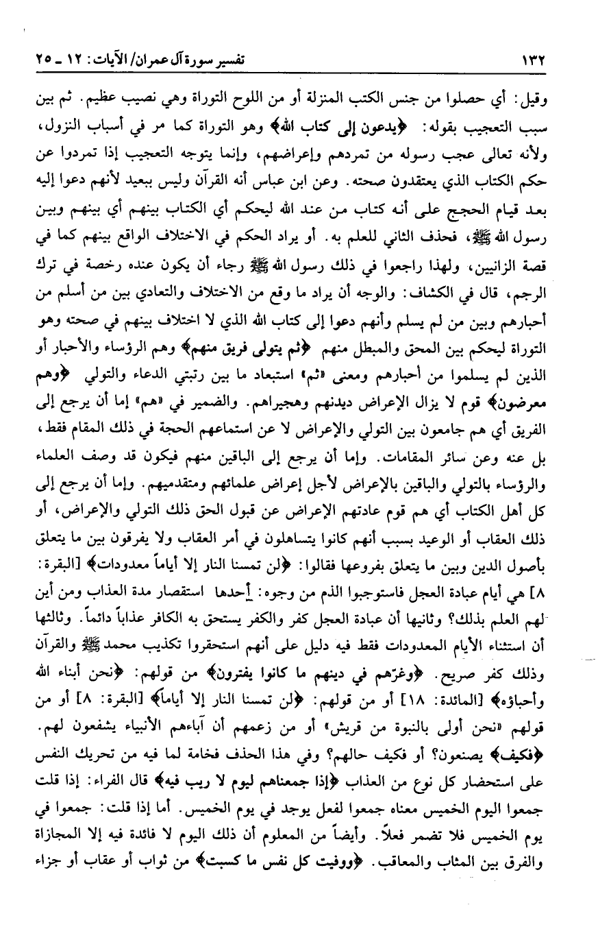 وقيل: أي حصلوا من جنس الكتب المنزلة أو من اللوح التوراة وهي نصيب عظيم. ثم بين سبب التعجيب بقوله: يُدْعَوْنَ إِلى كِتابِ اللَّهِ وهو التوراة كما مر في أسباب النزول، ولأنه تعالى عجب رسوله من تمردهم وإعراضهم، وإنما يتوجه التعجيب إذا تمردوا عن حكم الكتاب الذي يعتقدون صحته. وعن ابن عباس أنه القرآن وليس ببعيد لأنهم دعوا إليه بعد قيام الحجج على أنه كتاب من عند الله ليحكم أي الكتاب بينهم أي بينهم وبين رسول الله صلى الله عليه وسلم، فحذف الثاني للعلم به. أو يراد الحكم في الاختلاف الواقع بينهم كما في قصة الزانيين، ولهذا راجعوا في ذلك رسول الله صلى الله عليه وسلم رجاء أن يكون عنده رخصة في ترك الرجم، قال في الكشاف: والوجه أن يراد ما وقع من الاختلاف والتعادي بين من أسلم من أحبارهم وبين من لم يسلم وأنهم دعوا إلى كتاب الله الذي لا اختلاف بينهم في صحته وهو التوراة ليحكم بين المحق والمبطل منهم ثُمَّ يَتَوَلَّى فَرِيقٌ مِنْهُمْ وهم الرؤساء والأحبار أو الذين لم يسلموا من أحبارهم ومعنى «ثم» استبعاد ما بين رتبتي الدعاء والتولي وَهُمْ مُعْرِضُونَ قوم لا يزال الإعراض ديدنهم وهجيراهم. والضمير في «هم» إما أن يرجع إلى الفريق أي هم جامعون بين التولي والإعراض لا عن استماعهم الحجة في ذلك المقام فقط، بل عنه وعن سائر المقامات. وإما أن يرجع إلى الباقين منهم فيكون قد وصف العلماء والرؤساء بالتولي والباقين بالإعراض لأجل إعراض علمائهم ومتقدميهم. وإما أن يرجع إلى كل أهل الكتاب أي هم قوم عادتهم الإعراض عن قبول الحق ذلك التولي والإعراض، أو ذلك العقاب أو الوعيد بسبب أنهم كانوا يتساهلون في أمر العقاب ولا يفرقون بين ما يتعلق بأصول الدين وبين ما يتعلق بفروعها فقالوا: لَنْ تَمَسَّنَا النَّارُ إِلَّا أَيَّاماً مَعْدُوداتٍ [البقرة: