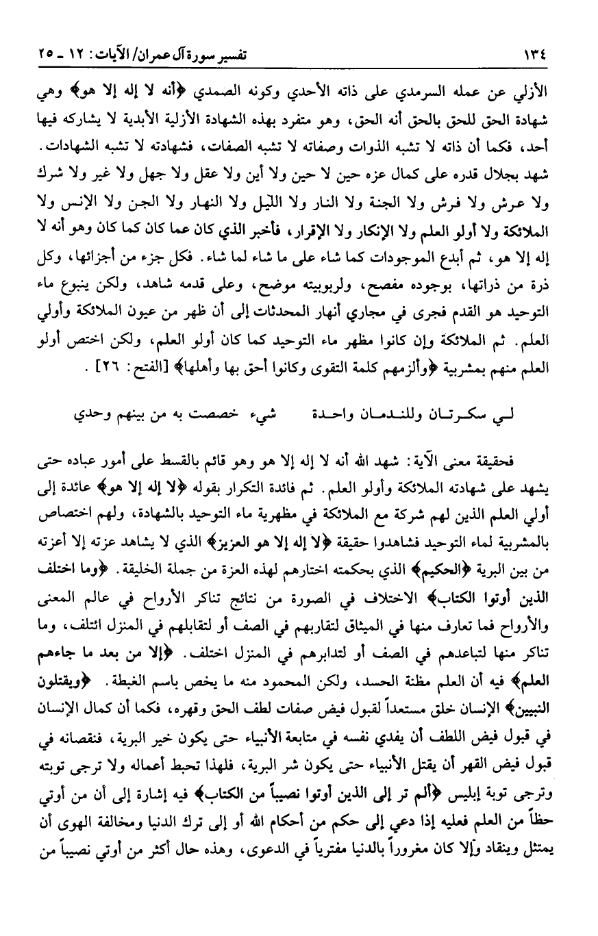 فحقيقة معنى الآية: شهد الله أنه لا إله إلا هو وهو قائم بالقسط على أمور عباده حتى يشهد على شهادته الملائكة وأولو العلم. ثم فائدة التكرار بقوله لا إِلهَ إِلَّا هُوَ عائدة إلى أولي العلم الذين لهم شركة مع الملائكة في مظهرية ماء التوحيد بالشهادة، ولهم اختصاص بالمشربية لماء التوحيد فشاهدوا حقيقة لا إِلهَ إِلَّا هُوَ الْعَزِيزُ الذي لا يشاهد عزته إلا أعزته من بين البرية الْحَكِيمُ الذي بحكمته اختارهم لهذه العزة من جملة الخليقة. وَمَا اخْتَلَفَ الَّذِينَ أُوتُوا الْكِتابَ الاختلاف في الصورة من نتائج تناكر الأرواح في عالم المعنى والأرواح فما تعارف منها في الميثاق لتقاربهم في الصف أو لتقابلهم في المنزل ائتلف، وما تناكر منها لتباعدهم في الصف أو لتدابرهم في المنزل اختلف. إِلَّا مِنْ بَعْدِ ما جاءَهُمُ الْعِلْمُ فيه أن العلم مظنة الحسد، ولكن المحمود منه ما يخص باسم الغبطة. وَيَقْتُلُونَ النَّبِيِّينَ الإنسان خلق مستعدا لقبول فيض صفات لطف الحق وقهره، فكما أن كمال الإنسان في قبول فيض اللطف أن يفدي نفسه في متابعة الأنبياء حتى يكون خير البرية، فنقصانه في قبول فيض القهر أن يقتل الأنبياء حتى يكون شر البرية، فلهذا تحبط أعماله ولا ترجى توبته وترجى توبة إبليس أَلَمْ تَرَ إِلَى الَّذِينَ أُوتُوا نَصِيباً مِنَ الْكِتابِ فيه إشارة إلى أن من أوتي حظا من العلم فعليه إذا دعي إلى حكم من أحكام الله أو إلى ترك الدنيا ومخالفة الهوى أن يمتثل وينقاد وإلا كان مغرورا بالدنيا مفتريا في الدعوى، وهذه حال أكثر من أوتي نصيبا من