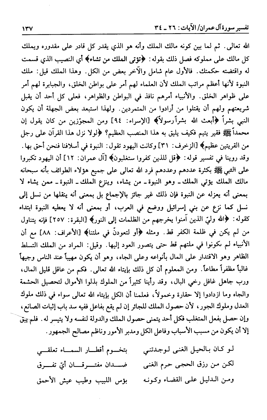 الله تعالى. ثم لما بين كونه مالك الملك وأنه هو الذي يقدر كل قادر على مقدوره ويملك كل مالك على مملوكه فصل ذلك بقوله: تُؤْتِي الْمُلْكَ مَنْ تَشاءُ أي النصيب الذي قسمت له واقتضته حكمتك. فالأول عام شامل والآخر بعض من الكل. وهذا الملك قيل: ملك النبوة لأنها أعظم مراتب الملك لأن العلماء لهم أمر على بواطن الخلق، والجبابرة لهم أمر على ظواهر الخلق. والأنبياء أمرهم نافذ في البواطن والظواهر، فعلى كل أحد أن يقبل شريعتهم ولهم أن يقتلوا من أرادوا من المتمردين. ولهذا استبعد بعض الجهلة أن يكون النبي بشرا أَبَعَثَ اللَّهُ بَشَراً رَسُولًا [الإسراء: 94] ومن المجوّزين من كان يقول إن محمدا صلى الله عليه وسلم فقير يتيم فكيف يليق به هذا المنصب العظيم؟ لَوْلا نُزِّلَ هذَا الْقُرْآنُ عَلى رَجُلٍ مِنَ الْقَرْيَتَيْنِ عَظِيمٍ [الزخرف: 31] وكانت اليهود تقول: النبوة في أسلافنا فنحن أحق بها.