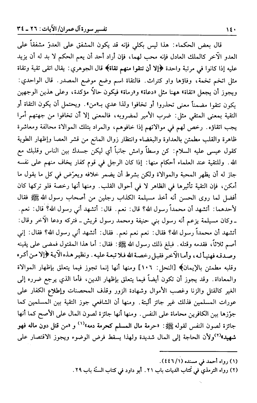 ويجوز أن يجعل «تقاة» هاهنا مثل «دعاة» و «رماة» فيكون حالا مؤكدة، وعلى هذين الوجهين يكون تتقوا مضمنا معنى تحذروا أو تخافوا ولذا عدي ب «من» . ويحتمل أن يكون التقاة أو التقية بمعنى المتقي مثل: ضرب الأمير لمضروبه، فالمعنى إلا أن تخافوا من جهتهم أمرا يجب اتقاؤه. رخص لهم في موالاتهم إذا خافوهم، والمراد بتلك الموالاة محالفة ومعاشرة ظاهرة والقلب مطمئن بالعداوة والبغضاء وانتظار زوال المانع من قشر العصا وإظهار الطوية كقول عيسى عليه السلام: كن وسطا وامش جانبا أي ليكن جسدك بين الناس وقلبك مع الله. وللتقية عند العلماء أحكام منها: إذا كان الرجل في قوم كفار يخاف منهم على نفسه جاز له أن يظهر المحبة والموالاة ولكن بشرط أن يضمر خلافه ويعرّض في كل ما يقول ما أمكن، فإن التقية تأثيرها في الظاهر لا في أحوال القلب. ومنها أنها رخصة فلو تركها كان أفضل لما