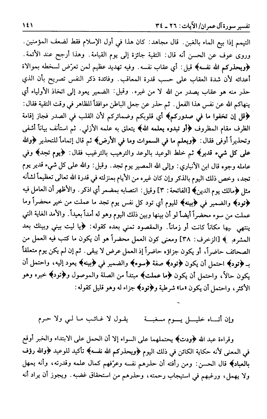 قُلْ إِنْ تُخْفُوا ما فِي صُدُورِكُمْ أي قلوبكم وضمائركم لأن القلب في الصدر فجاز إقامة الظرف مقام المظروف أَوْ تُبْدُوهُ يَعْلَمْهُ اللَّهُ يتعلق به علمه الأزلي. ثم استأنف بيانا أشفى وتحذيرا أوفى فقال: وَيَعْلَمُ ما فِي السَّماواتِ وَما فِي الْأَرْضِ ثم قال إتماما للتحذير وَاللَّهُ عَلى كُلِّ شَيْءٍ قَدِيرٌ ثم خلط الوعيد بالوعد والترهيب بالترغيب فقال: يَوْمَ تَجِدُ وفي عامله وجوه قال ابن الأنباري: وإلى الله المصير يوم تجد. وقيل: والله على كل شيء قدير يوم تجد، وخص ذلك اليوم بالذكر وإن كان غيره من الأيام بمنزلته في قدرة الله تعالى تعظيما لشأنه مثل مالِكِ يَوْمِ الدِّينِ [الفاتحة: 3] وقيل: انتصابه بمضمر أي اذكر. والأظهر أن العامل فيه تَوَدُّ والضمير في بَيْنَهُ لليوم أي تود كل نفس يوم تجد ما عملت من خير محضرا وما عملت من سوء محضرا أيضا لو أن بينها وبين ذلك اليوم وهو له أمدا بعيدا. والأمد الغاية التي ينتهي ليها مكانا كانت أو زمانا. والمقصود تمني بعده كقوله: يا لَيْتَ بَيْنِي وَبَيْنَكَ بُعْدَ الْمَشْرِقَيْنِ [الزخرف: 38] ومعنى كون العمل محضرا هو أن يكون ما كتب فيه العمل من الصحائف حاضرا، أو يكون جزاؤه حاضرا إذ العمل عرض لا يبقى. ثم إن لم يكن يوم متعلقا ب تَوَدُّ احتمل أن يكون تَوَدُّ صفة سُوءٍ والضمير في بَيْنَهُ يعود إليه، واحتمل أن يكون حالا، واحتمل أن يكون ما عَمِلَتْ مبتدأ من الصلة والموصول وتَوَدُّ خبره وهو الأكثر، واحتمل أن يكون «ما» شرطية وتَوَدُّ جزاء له وهو قليل كقوله: