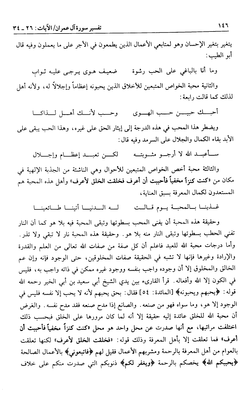 وأما درجات محبة الله للعبد فاعلم أن كل صفة من صفات الله تعالى من العلم والقدرة والإرادة وغيرها فإنها لا تشبه في الحقيقة صفات المخلوقين، حتى الوجود فإنه وإن عم الخالق والمخلوق إلا أن وجوده واجب بنفسه ووجود غيره ممكن في ذاته واجب به، فليس في الكون إلا الله وأفعاله. قرأ القارئ بين يدي الشيخ أبي سعيد بن أبي الخير رحمه الله قوله: يُحِبُّهُمْ وَيُحِبُّونَهُ [المائدة: 54] فقال: بحق يحبهم لأنه لا يحب إلا نفسه فليس في الوجود إلا هو، وما سواه فهو من صنعه. والصانع إذا مدح صنعه فقد مدح نفسه. والغرض أن محبة الله للخلق عائدة إليه حقيقة إلا أنه لما كان مرورها على الخلق فبحسب ذلك اختلفت مراتبها، مع أنها صدرت عن محل واحد هو محل