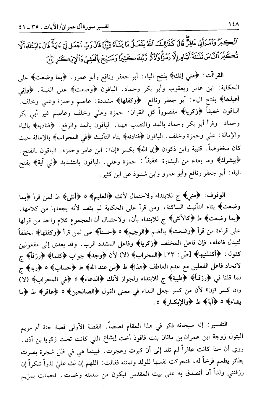 إنه سبحانه ذكر في هذا المقام قصصا. القصة الأولى قصة حنة أم مريم البتول زوجة ابن عمران بن ماثان بنت فاقوذ أخت إيشاع التي كانت تحت زكريا بن أذن.