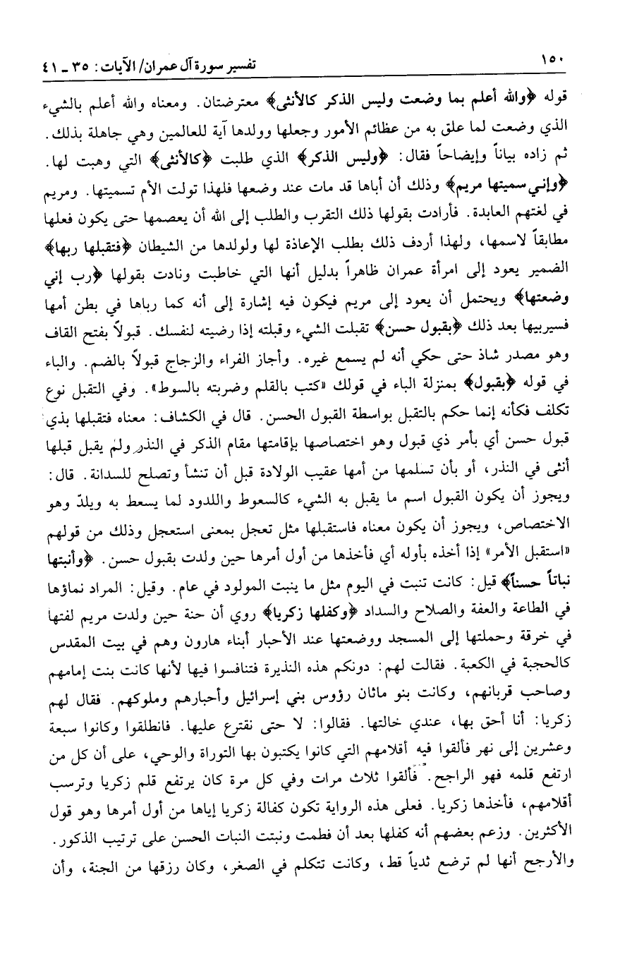 فعلى هذه الرواية تكون كفالة زكريا إياها من أول أمرها وهو قول الأكثرين. وزعم بعضهم أنه كفلها بعد أن فطمت ونبتت النبات الحسن على ترتيب الذكور.