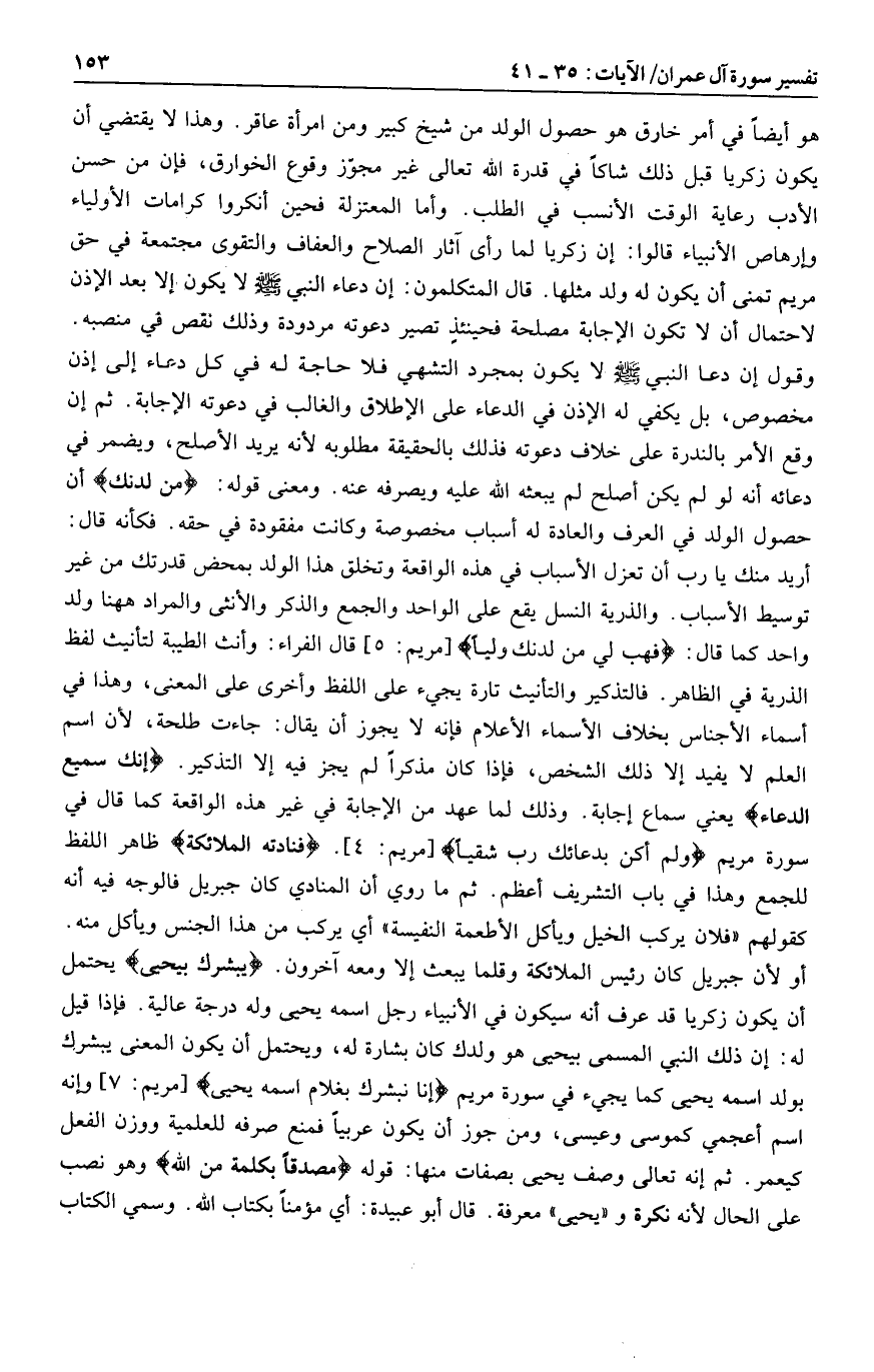 أو لأن جبريل كان رئيس الملائكة وقلما يبعث إلا ومعه آخرون. يُبَشِّرُكَ بِيَحْيى يحتمل أن يكون زكريا قد عرف أنه سيكون في الأنبياء رجل اسمه يحيى وله درجة عالية. فإذا قيل له: إن ذلك النبي المسمى بيحيى هو ولدك كان بشارة له، ويحتمل أن يكون المعنى يبشرك بولد اسمه يحيى كما يجيء في سورة مريم إِنَّا نُبَشِّرُكَ بِغُلامٍ اسْمُهُ يَحْيى [مريم: 7] وإنه اسم أعجمي كموسى وعيسى، ومن جوز أن يكون عربيا فمنع صرفه للعلمية ووزن الفعل كيعمر. ثم إنه تعالى وصف يحيى بصفات منها: قوله مُصَدِّقاً بِكَلِمَةٍ مِنَ اللَّهِ وهو نصب على الحال لأنه نكرة و «يحيى» معرفة. قال أبو عبيدة: أي مؤمنا بكتاب الله. وسمي الكتاب