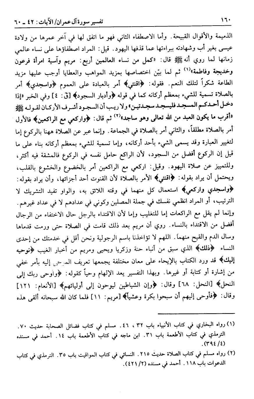 وإنما لم يقل مع الراكعات إما للتغليب وإما لأن الاقتداء بالرجل حال الاختفاء من الرجال أفضل من الاقتداء بالنساء. روي أن مريم بعد ذلك قامت في الصلاة حتى ورمت قدماها وسال الدم والقيح منهما. اللهم لا تؤاخذنا باسم الرجولية ونحن أقل في خدمتك من إحدى النساء ذلِكَ الذي سبق من أنباء حنة وزكريا ويحيى ومريم من أخبار الغيب نُوحِيهِ إِلَيْكَ قد ورد الكتاب بالإيحاء على معان مختلفة يجمعها تعريف الموحى إليه بأمر خفي من إشارة أو كتابة أو غيرها. وبهذا التفسير يعد الإلهام وحيا كقوله: وَأَوْحى رَبُّكَ إِلَى النَّحْلِ [النحل: 68] وقال: وَإِنَّ الشَّياطِينَ لَيُوحُونَ إِلى أَوْلِيائِهِمْ [الأنعام: 121] وقال: فَأَوْحى إِلَيْهِمْ أَنْ سَبِّحُوا بُكْرَةً وَعَشِيًّا [مريم: 11] فلما كان الله سبحانه ألقى هذه