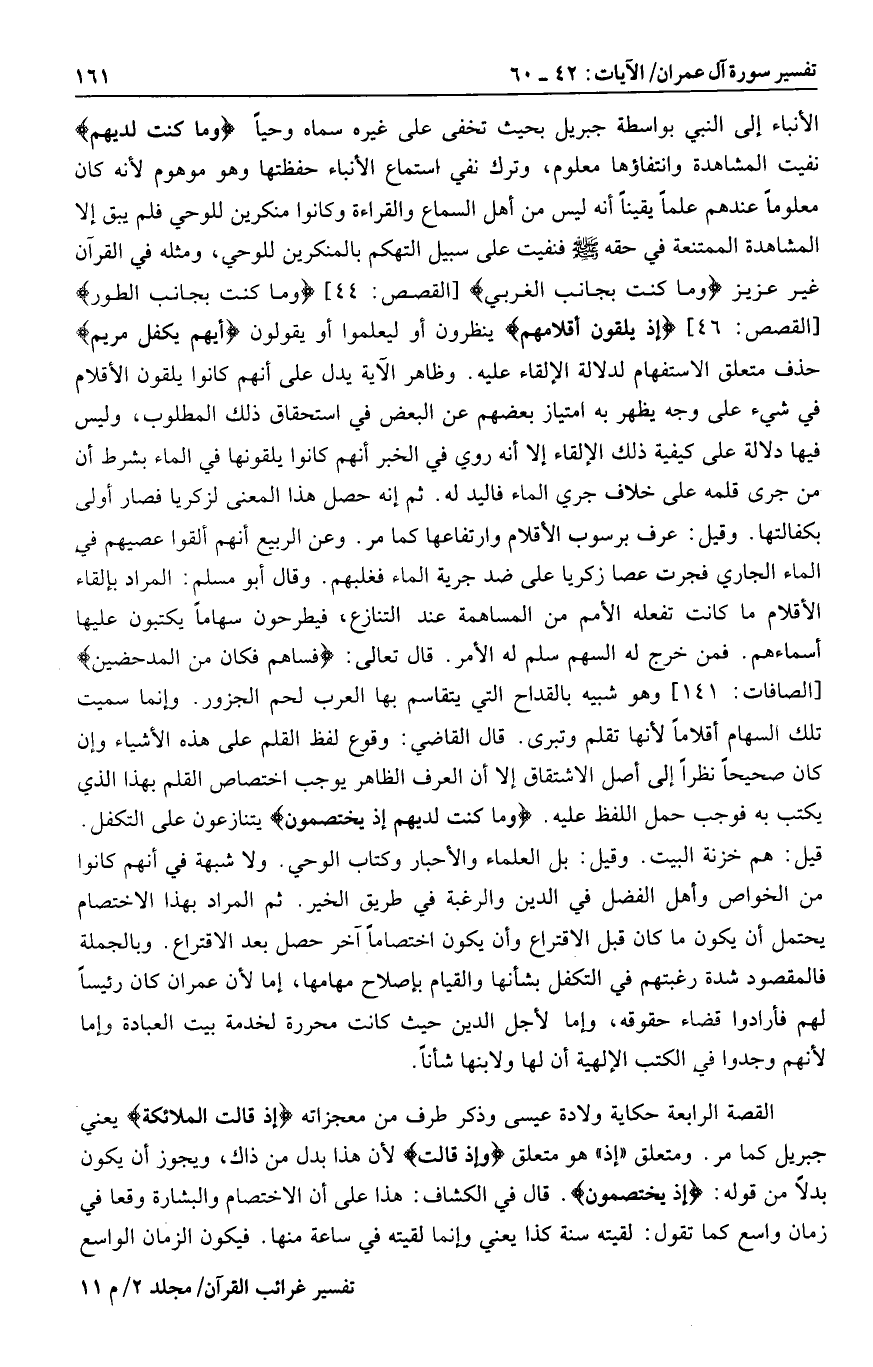 [الصافات: 141] وهو شبيه بالقداح التي يتقاسم بها العرب لحم الجزور. وإنما سميت تلك السهام أقلاما لأنها تقلم وتبرى. قال القاضي: وقوع لفظ القلم على هذه الأشياء وإن كان صحيحا نظرا إلى أصل الاشتقاق إلا أن العرف الظاهر يوجب اختصاص القلم بهذا الذي يكتب به فوجب حمل اللفظ عليه. وَما كُنْتَ لَدَيْهِمْ إِذْ يَخْتَصِمُونَ يتنازعون على التكفل.