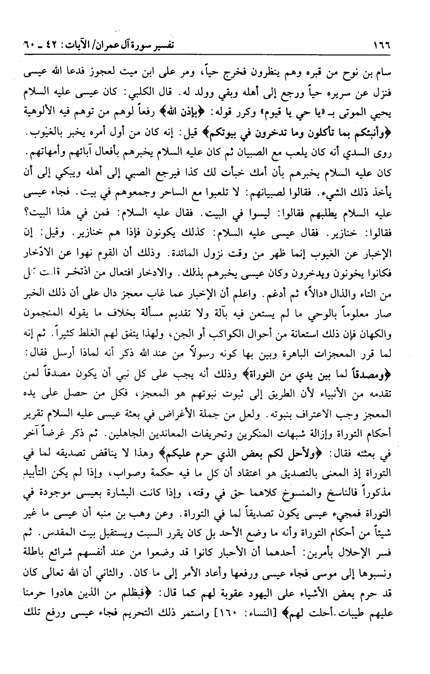 وَمُصَدِّقاً لِما بَيْنَ يَدَيَّ مِنَ التَّوْراةِ وذلك أنه يجب على كل نبي أن يكون مصدقا لمن تقدمه من الأنبياء لأن الطريق إلى ثبوت نبوتهم هو المعجز، فكل من حصل على يده المعجز وجب الاعتراف بنبوته. ولعل من جملة الأغراض في بعثة عيسى عليه السلام تقرير أحكام التوراة وإزالة شبهات المنكرين وتحريفات المعاندين الجاهلين. ثم ذكر غرضا آخر في بعثته فقال: وَلِأُحِلَّ لَكُمْ بَعْضَ الَّذِي حُرِّمَ عَلَيْكُمْ وهذا لا يناقض تصديقه لما في التوراة إذ المعنى بالتصديق هو اعتقاد أن كل ما فيه حكمة وصواب، وإذا لم يكن التأبيد مذكورا فالناسخ والمنسوخ كلاهما حق في وقته، وإذا كانت البشارة بعيسى موجودة في التوراة فمجيء عيسى يكون تصديقا لما في التوراة. وعن وهب بن منبه أن عيسى ما غير شيئا من أحكام التوراة وأنه ما وضع الأحد بل كان يقرر السبت ويستقبل بيت المقدس. ثم فسر الإحلال بأمرين: أحدهما أن الأحبار كانوا قد وضعوا من عند أنفسهم شرائع باطلة ونسبوها إلى موسى فجاء عيسى ورفعها وأعاد الأمر إلى ما كان. والثاني أن الله تعالى كان قد حرم بعض الأشياء على اليهود عقوبة لهم كما قال: فَبِظُلْمٍ مِنَ الَّذِينَ هادُوا حَرَّمْنا عَلَيْهِمْ طَيِّباتٍ أُحِلَّتْ لَهُمْ [النساء: 160] واستمر ذلك التحريم فجاء عيسى ورفع تلك