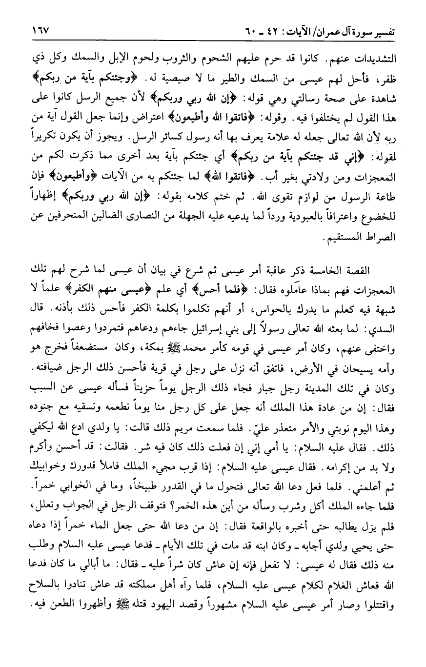 القصة الخامسة ذكر عاقبة أمر عيسى ثم شرع في بيان أن عيسى لما شرح لهم تلك المعجزات فهم بماذا عاملوه فقال: فَلَمَّا أَحَسَّ أي علم عِيسى مِنْهُمُ الْكُفْرَ علما لا شبهة فيه كعلم ما يدرك بالحواس، أو أنهم تكلموا بكلمة الكفر فأحس ذلك بأذنه. قال السدي: لما بعثه الله تعالى رسولا إلى بني إسرائيل جاءهم ودعاهم فتمردوا وعصوا فخافهم واختفى عنهم، وكان أمر عيسى في قومه كأمر محمد صلى الله عليه وسلم بمكة، وكان مستضعفا فخرج هو وأمه يسيحان في الأرض، فاتفق أنه نزل على رجل في قرية فأحسن ذلك الرجل ضيافته.