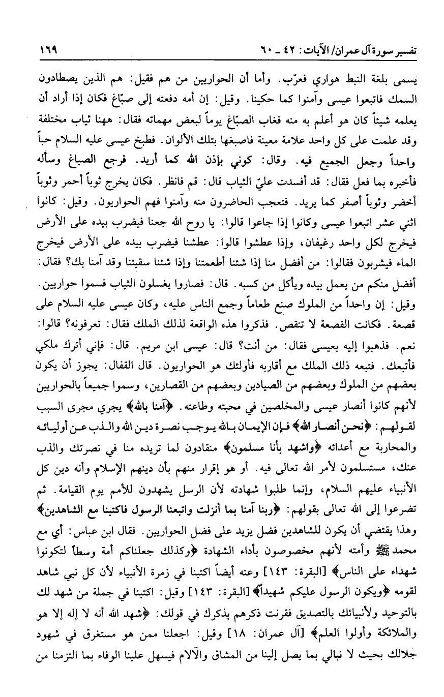 نعم. فذهبوا إليه بعيسى فقال: من أنت؟ قال: عيسى ابن مريم. قال: فإني أترك ملكي فأتبعك. فتبعه ذلك الملك مع أقاربه فأولئك هو الحواريون. قال القفال: يجوز أن يكون بعضهم من الملوك وبعضهم من الصيادين وبعضهم من القصارين، وسموا جميعا بالحواريين لأنهم كانوا أنصار عيسى والمخلصين في محبته وطاعته. آمَنَّا بِاللَّهِ يجري مجرى السبب لقولهم: نَحْنُ أَنْصارُ اللَّهِ فإن الإيمان بالله يوجب نصرة دين الله والذب عن أوليائه والمحاربة مع أعدائه وَاشْهَدْ بِأَنَّا مُسْلِمُونَ منقادون لما تريده منا في نصرتك والذب عنك، مستسلمون لأمر الله تعالى فيه. أو هو إقرار منهم بأن دينهم الإسلام وأنه دين كل الأنبياء عليهم السلام، وإنما طلبوا شهادته لأن الرسل يشهدون للأمم يوم القيامة. ثم تضرعوا إلى الله تعالى بقولهم: رَبَّنا آمَنَّا بِما أَنْزَلْتَ وَاتَّبَعْنَا الرَّسُولَ فَاكْتُبْنا مَعَ الشَّاهِدِينَ وهذا يقتضي أن يكون للشاهدين فضل يزيد على فضل الحواريين. فقال ابن عباس: أي مع محمد صلى الله عليه وسلم وأمته لأنهم مخصوصون بأداء الشهادة وَكَذلِكَ جَعَلْناكُمْ أُمَّةً وَسَطاً لِتَكُونُوا شُهَداءَ عَلَى النَّاسِ [البقرة: 143] وعنه أيضا اكتبنا في زمرة الأنبياء لأن كل نبي شاهد لقومه وَيَكُونَ الرَّسُولُ عَلَيْكُمْ شَهِيداً [البقرة: 143] وقيل: اكتبنا في جملة من شهد لك بالتوحيد ولأنبيائك بالتصديق فقرنت ذكرهم بذكرك في قولك: شَهِدَ اللَّهُ أَنَّهُ لا إِلهَ إِلَّا هُوَ وَالْمَلائِكَةُ وَأُولُوا الْعِلْمِ [آل عمران: 18] وقيل: اجعلنا ممن هو مستغرق في شهود جلالك بحيث لا نبالي بما يصل إلينا من المشاق والآلام فيسهل علينا الوفاء بما التزمنا من