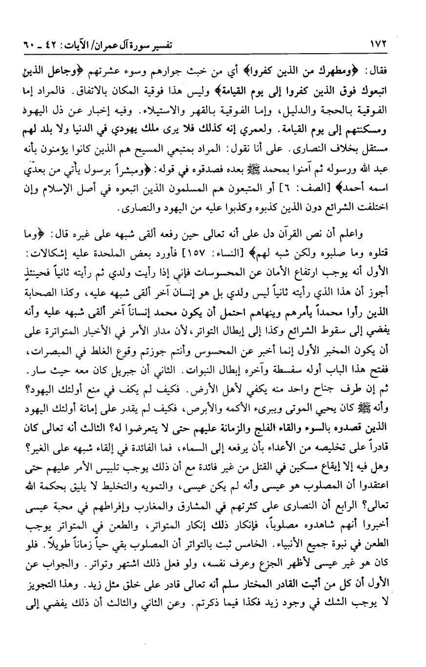 وهل فيه إلا إيقاع مسكين في القتل من غير فائدة مع أن ذلك يوجب تلبيس الأمر عليهم حتى اعتقدوا أن المصلوب هو عيسى وأنه لم يكن عيسى، والتمويه والتخليط لا يليق بحكمة الله تعالى؟ الرابع أن النصارى على كثرتهم في المشارق والمغارب وإفراطهم في محبة عيسى أخبروا أنهم شاهدوه مصلوبا، فإنكار ذلك إنكار المتواتر، والطعن في المتواتر يوجب الطعن في نبوة جميع الأنبياء. الخامس ثبت بالتواتر أن المصلوب بقي حيا زمانا طويلا. فلو كان هو غير عيسى لأظهر الجزع وعرف نفسه، ولو فعل ذلك اشتهر وتواتر. والجواب عن الأول أن كل من أثبت القادر المختار سلم أنه تعالى قادر على خلق مثل زيد. وهذا التجويز لا يوجب الشك في وجود زيد فكذا فيما ذكرتم. وعن الثاني والثالث أن ذلك يفضي إلى